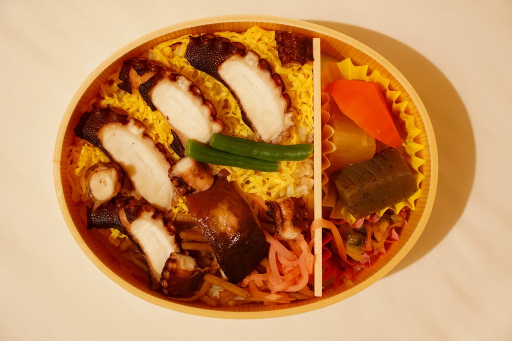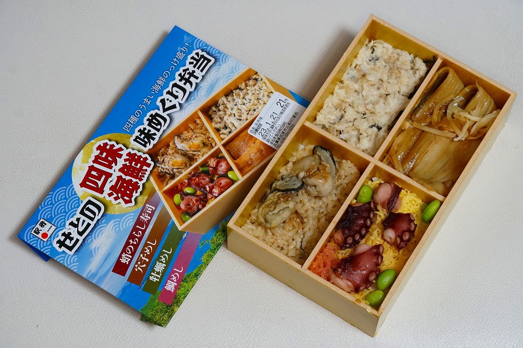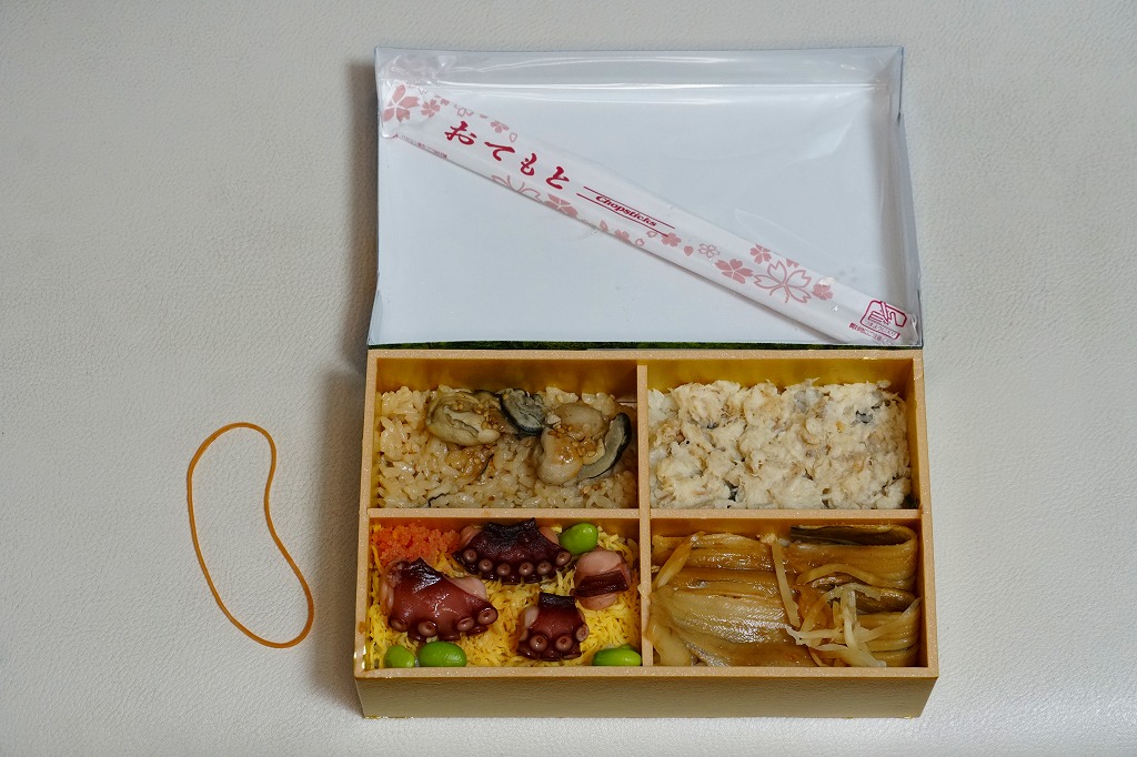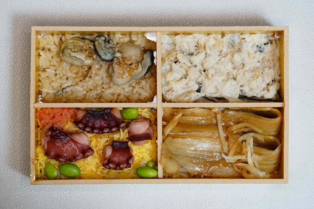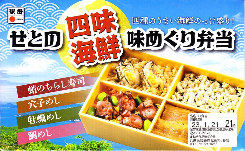 秋冬の駅弁大会シーズンに向けた、2022(令和4)年秋の新商品か。過去にも姫路駅弁の実演販売などで使われた、4区画の長方形容器に、蛸(たこ)のちらし寿司、穴子めし、牡蠣(かき)めし、鯛めしを詰める。これらの内容はすべて既存の姫路駅弁で、それぞれおいしかった記憶があり、これは便利でうまい姫路駅弁一覧。おかずも漬物も調味料も何も添付しない潔さは、催事向けだからかどうか。翌2023年シーズンまでの販売か。