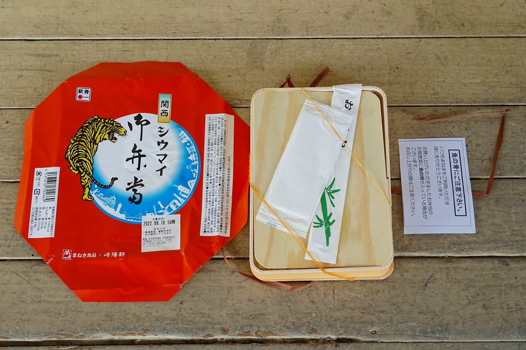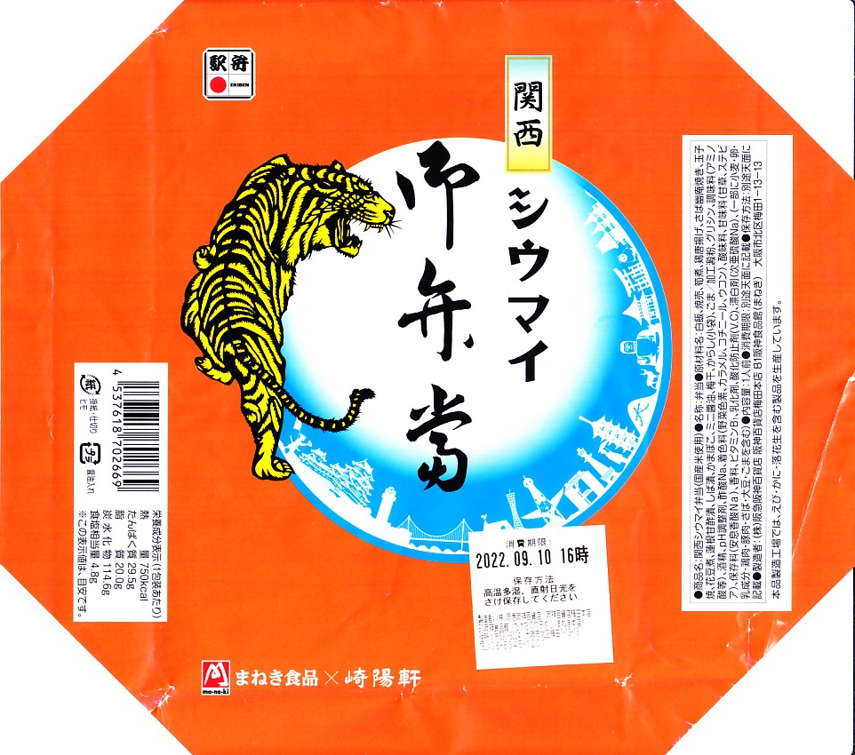 掛紙の絵柄はシウマイ弁当に準じ、龍が虎になり、水晶玉のシルエットが姫路城その他京阪神エリアの名所となった。経木折はシウマイ弁当と同じものと思われ、これに横浜版よりやや小さなふたをして輪ゴムでしばり、掛紙をかけて太めのひもで十字にしばる。中身は白ごまの日の丸俵飯、関西シウマイ5個、拍子木切りの細長い筍煮、サバ幽庵焼、あご出汁の鶏唐揚、かまぼこと出し巻玉子、花豆煮、酢れんこん、しば漬、からし袋、魚型の醤油入れ。そんな構成も、横浜駅弁にそっくり。ただし、味付けや色合いは淡め。塩や醤油が薄く、出汁の味が利いている。