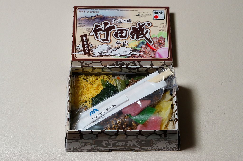 秋冬の駅弁大会シーズンに向けた、2015(平成27)年秋の新商品か。前年に発売した「天空の城竹田城弁当」と同じく、石垣を模したボール紙の容器を使用、茶飯の上に鶏肉、たこ、ささがきごぼう、煮玉子、わかめ、サツマイモ、れんこん、シイタケ、くぎ煮、大根桜漬を散らす。