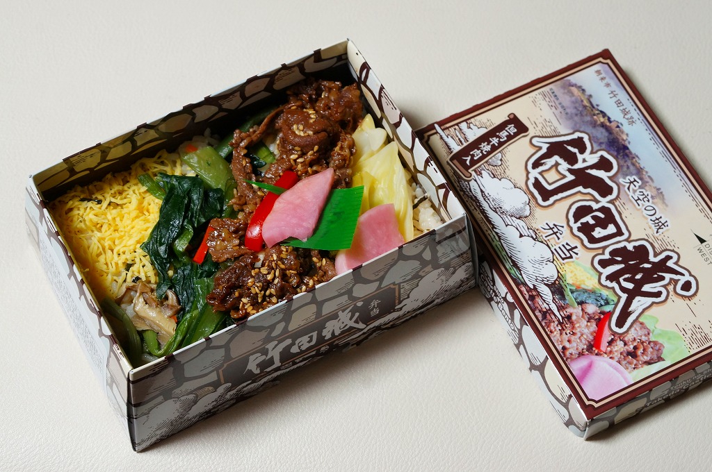 2014(平成26)年の6月までに発売か。城の石垣を絵柄と形状で再現した感じのボール紙製容器に、姫路駅名物「えきそば」で使うだし汁で炊いた御飯を直に詰め、錦糸卵、小松菜漬、但馬牛の焼肉、キャベツ煮浸しのストライプで覆い、シイタケ煮とダイコン漬を添える。駅弁大会での購入がたたったのか、普段からこうなのか、メインの但馬牛焼肉は少なく、脂も固さもブランド牛のそれではなかった。1年間ほどの販売か。2018〜2019年の駅弁大会シーズンにもデパートやスーパーで販売された模様。
