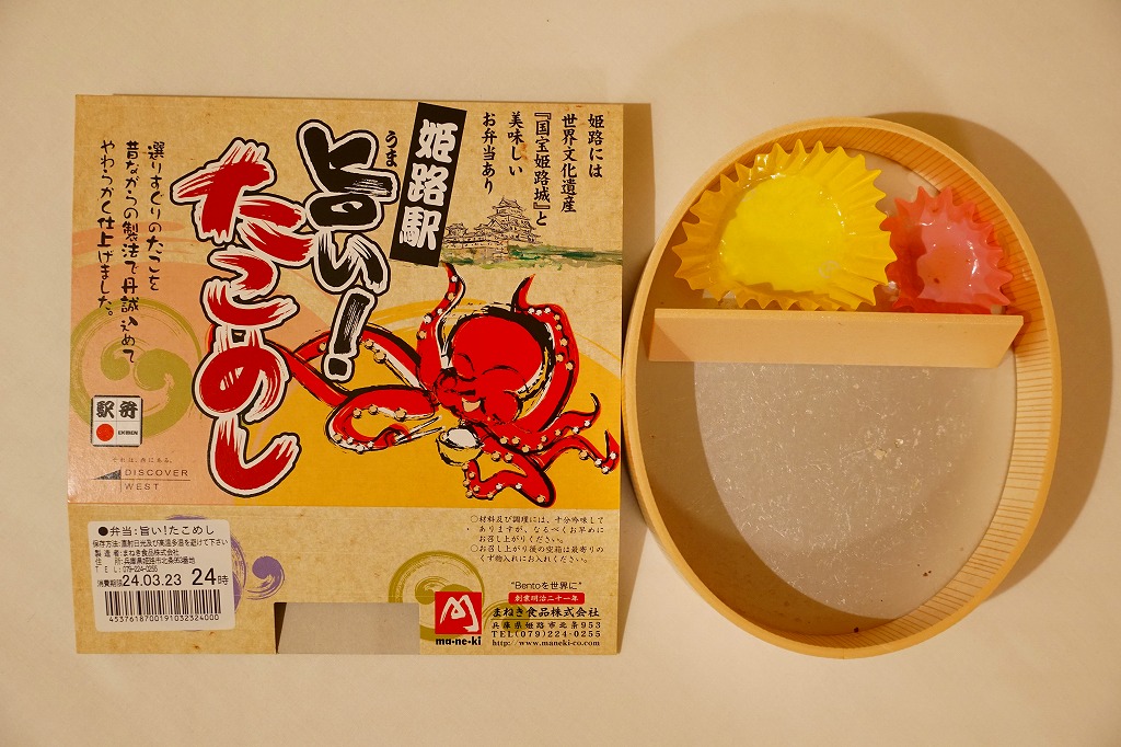 2000年代に姫路駅で発売か。楕円形の容器にだし飯を詰め、タコ煮のスライスと錦糸卵で覆い、煮物を添える。タコ駅弁の筆頭である西明石駅「ひっぱりだこ飯」や、タコ駅弁の元祖である三原駅「珍辨たこめし」や、かつての高松駅「たこ飯」とは違い、知名度がなく、2000年代には明石ダコの使用をうたったタコの身と味に締まりがなく、駅弁催事に出てこない。だし飯の柔らかな食感と風味も手伝い、柔らかいタコをたっぷり食べさせてくれる印象を受ける、唯一無二のタコ駅弁。タコの駅弁そのものが珍しい存在なので、比べる相手もこれくらいしかいない。価格は2010年時点で930円、2014年時点で1,000円、2019年時点で1,100円、2022年時点で1,150円、2024年時点で1,180円、2025年時点で1,250円。