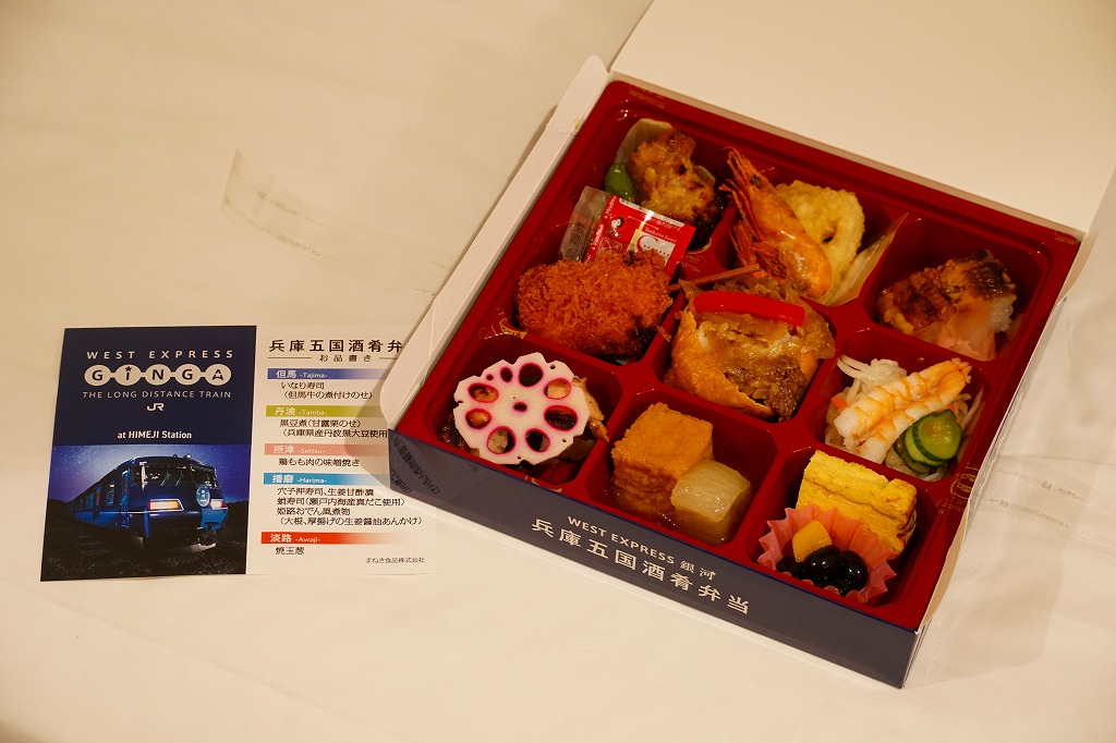 2020(令和2)年9月11日に姫路駅で発売。駅弁の名前は「兵庫五国酒肴(しゅこう)弁当」とも。専用のボール紙箱には、同日に営業運転を開始したJR西日本の団体専用列車「WEST EXPRESS 銀河」(ウエストエクスプレスぎんが)の美しい画像を掲載し、添付のおしながきにも使われる。日中の販売に加え、この列車が金曜深夜に姫路駅へ来た場合はそのホーム上でも販売する。