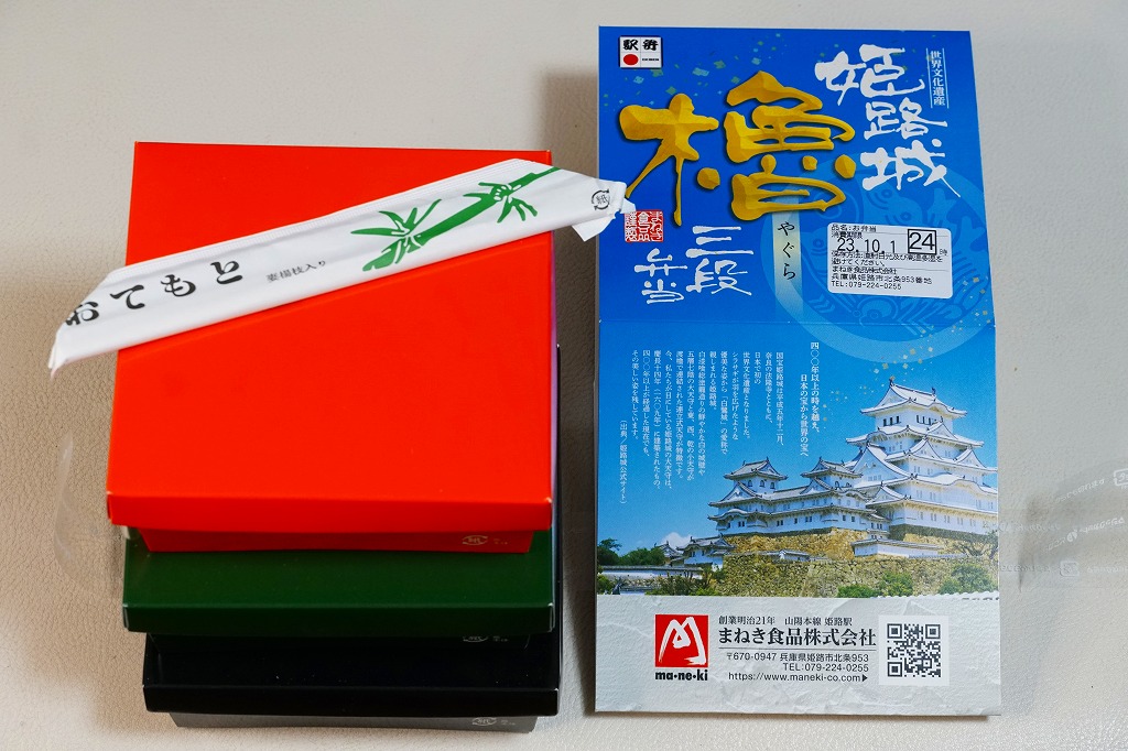 秋冬の駅弁大会シーズンに向けた、2022(令和4)年秋の新商品か。翌2023年10月に改めて新商品として出てきて、JR東日本の駅弁キャンペーン「駅弁味の陣2023」にエントリー。昭和60年代に「博多三色弁当」など各地で駅弁の容器として使われ、2017年にJR30周年で復刻販売された当時の姫路駅弁「櫓弁当」でも使われた、赤と緑と黒の紙箱を重ねた容器を収めるスリーブには、もちろん今の姫路城の写真と、その紹介文や商品名が描かれる。姫路城世界文化遺産30周年で三段にしたのかどうか。
