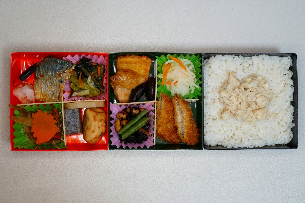 中身は黒い下段が鯛飯、緑の中段と赤い上段は松花堂弁当のように4区画に仕切られ、白身魚フライ、大根なます、ひじき煮、黒豆と鶏照焼と野菜さつま揚げ、がんもどきとれんこんとこんにゃくの煮物、小松菜漬、さば塩焼きとカニ風味かまぼこ、姫路城型ニンジンと金平ごぼう。中身と姫路や姫路城の関連はよくわからなくても、おかずの品揃えの豊富さと、出汁が豊かな鯛飯が印象的。年内で終売か。