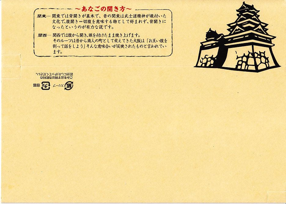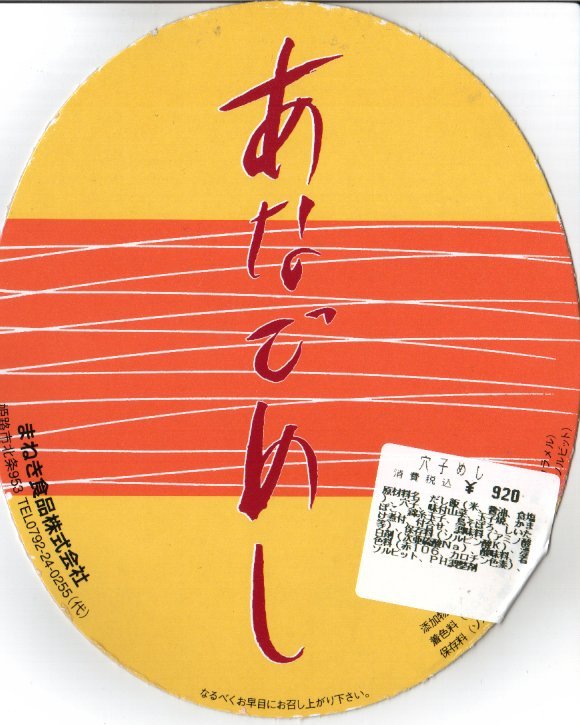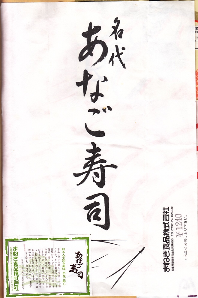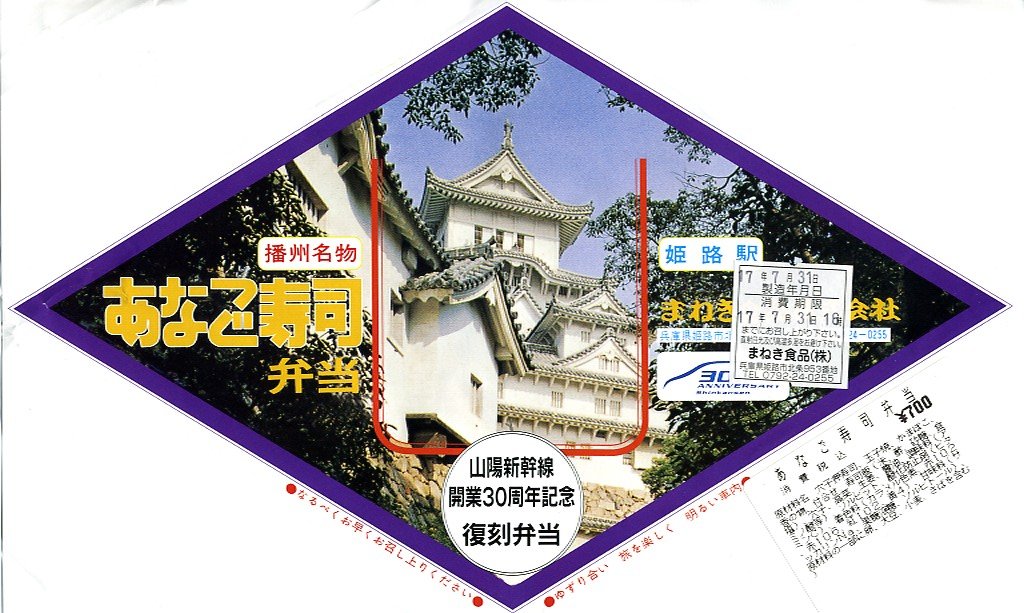 1982(昭和57)年3月25日12時の調製と思われる、昔の姫路駅弁の掛紙。調製印に製造年がないが、1972(昭和47)年に開業した新幹線新大阪・岡山間の開業10周年のシールが貼られており、これで判断。姫路のアナゴ駅弁は、めしより寿司が優勢だと思う。