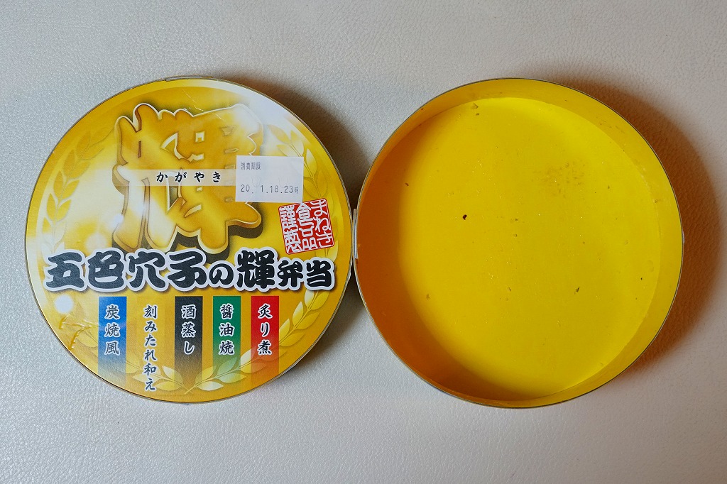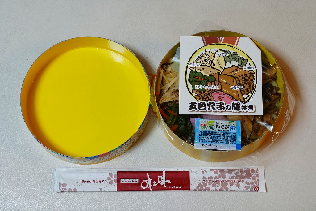2020(令和2)年1月の京王百貨店の駅弁大会で実演販売。前年の「四味」が、今年はひとつ増えて「五味」に。真ん丸のボール紙製容器は、外側も内側も金色に輝く。これにまねきのえきそばの出汁で炊いた御飯を詰め、アナゴの酒蒸し、アナゴの炙り煮、アナゴの刻みたれ和え、アナゴの炭焼風、アナゴの醤油焼を載せ、すき間を山菜と小松菜と大根漬で埋める。
