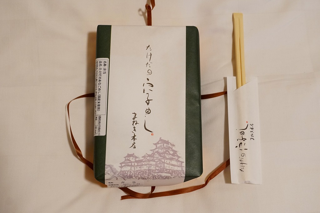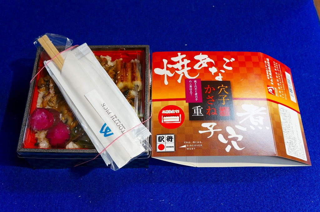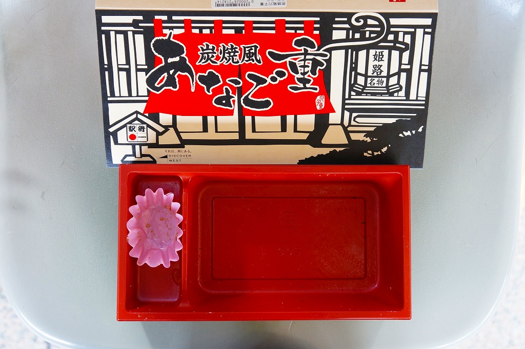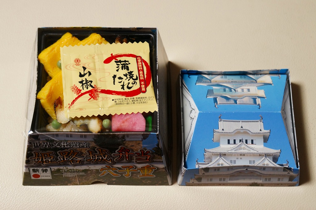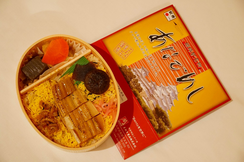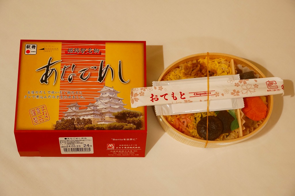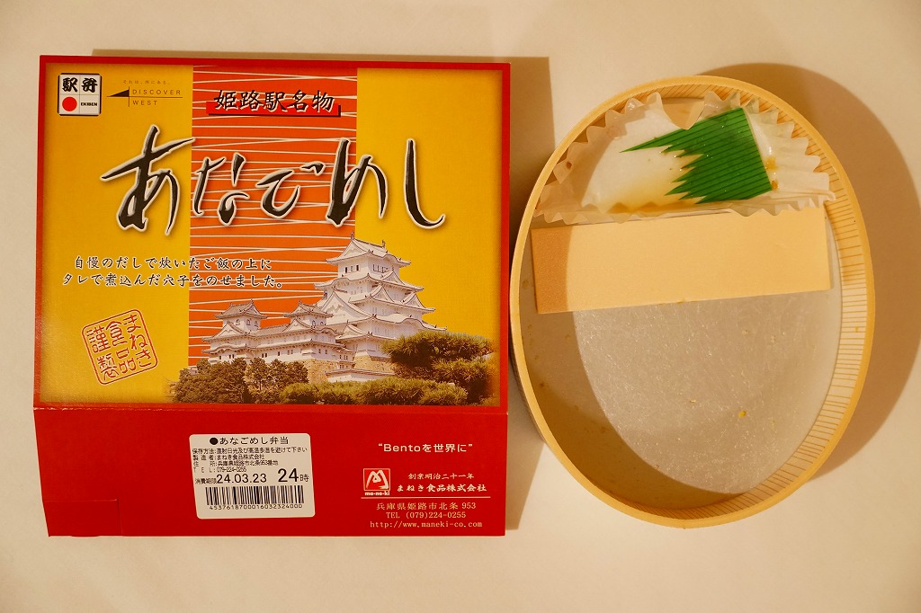 各地の駅弁でおなじみの発泡材枠な長方形の容器に、白御飯を詰めて刻み海苔を振り錦糸卵をまぶし、その上に焼きアナゴを並べて刻みアナゴも添えて紅ショウガを置き、菜の花ゴマ和えときんぴらごぼうを付け合わせる。東京での、駅弁売店の中の小さな実演販売ブースでの調製は制約がとても大きかったのだろう、焼きアナゴはアッサリし過ぎて、分量も非常に物足りなく、それでいてこの価格。姫路駅のアナゴ駅弁はこんなものではない。以後もどうも東京駅限定の姫路駅弁として売られる模様。価格は発売時や購入時で1,100円、2020年時点で1,180円。2022年度までの販売か。