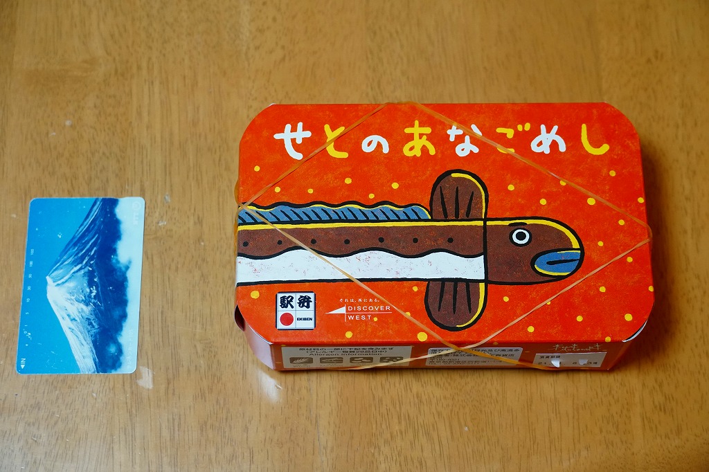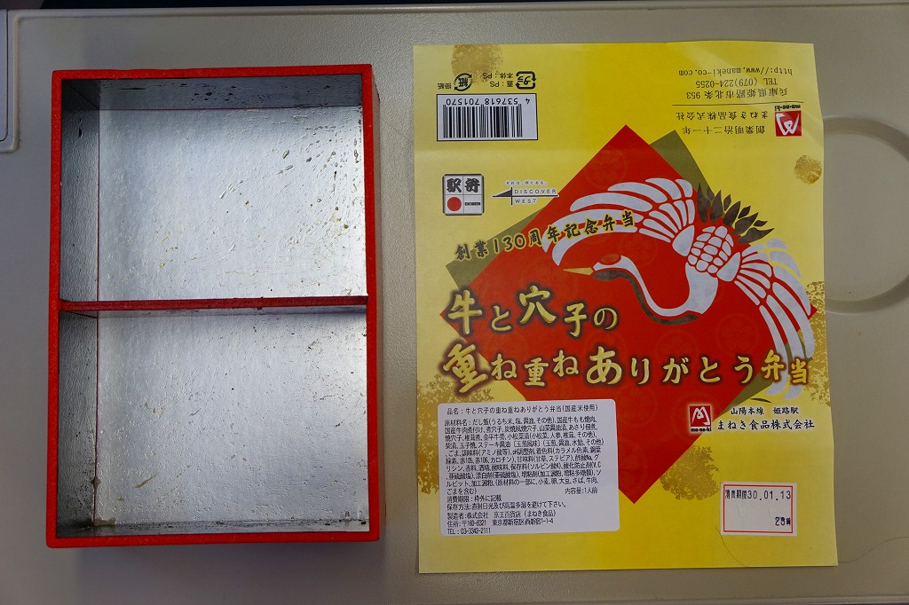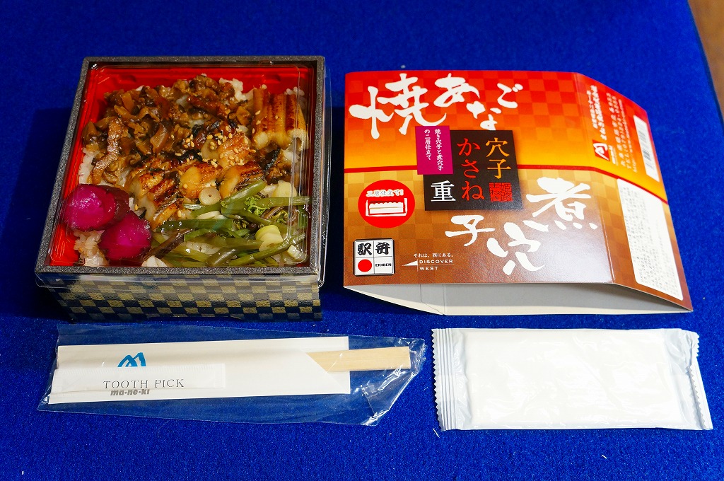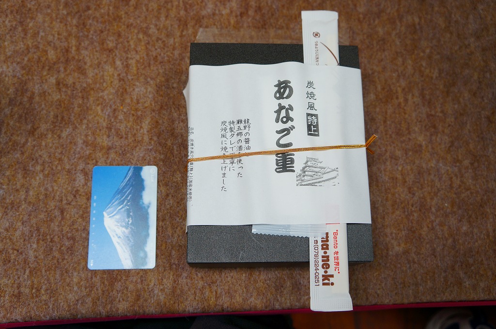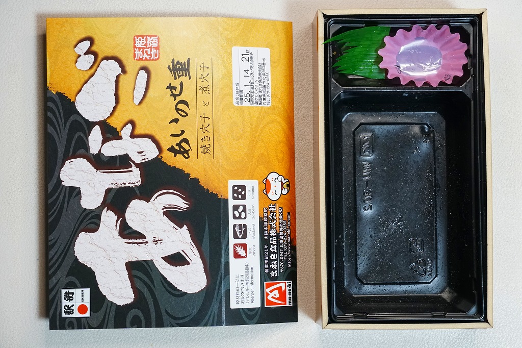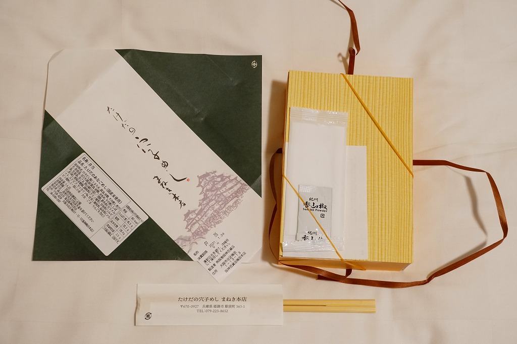 各地の駅弁でおなじみの発泡材枠な長方形の容器に、白御飯を詰めて刻み海苔を振り錦糸卵をまぶし、その上に焼きアナゴを並べて刻みアナゴも添えて紅ショウガを置き、菜の花ゴマ和えときんぴらごぼうを付け合わせる。東京での、駅弁売店の中の小さな実演販売ブースでの調製は制約がとても大きかったのだろう、焼きアナゴはアッサリし過ぎて、分量も非常に物足りなく、それでいてこの価格。姫路駅のアナゴ駅弁はこんなものではない。以後もどうも東京駅限定の姫路駅弁として売られる模様。価格は発売時や購入時で1,100円、2020年時点で1,180円。2022年度までの販売か。