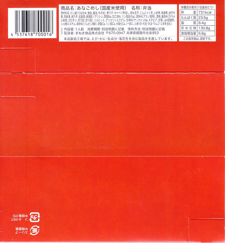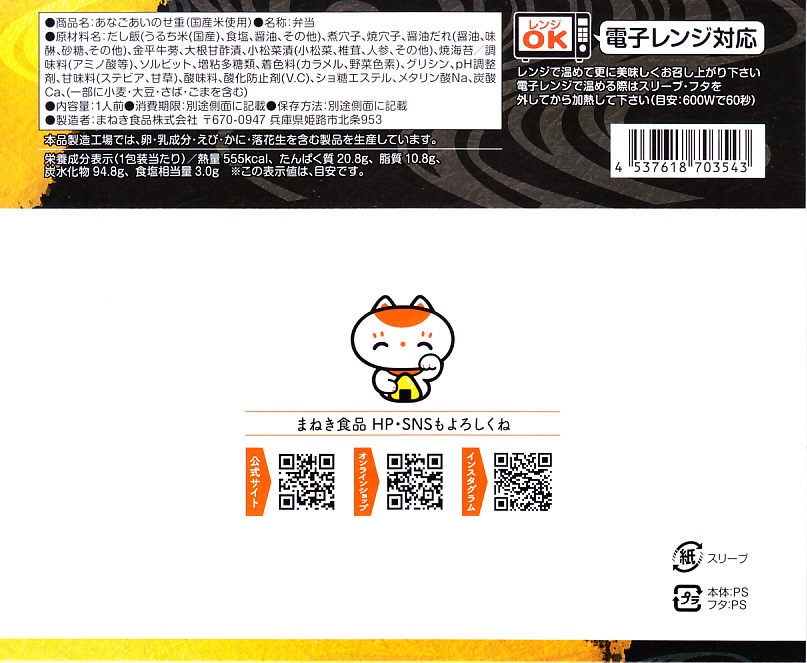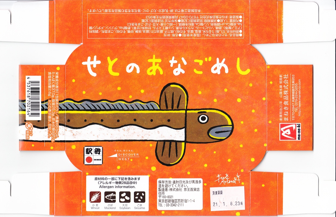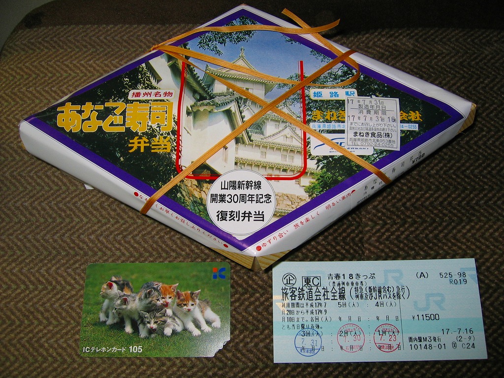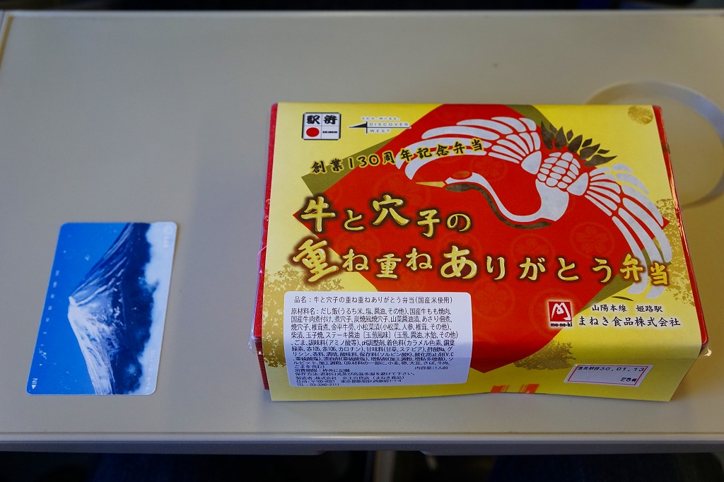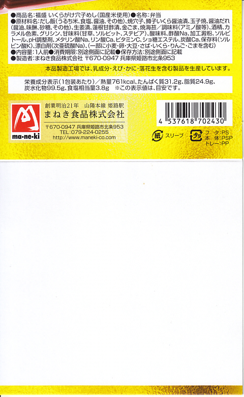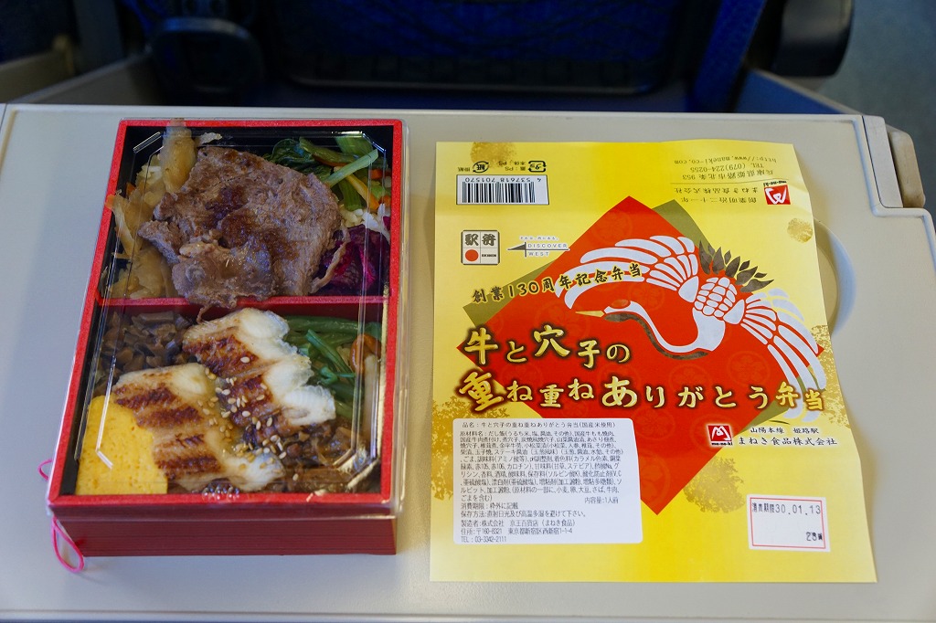 各地の駅弁でおなじみの発泡材枠な長方形の容器に、白御飯を詰めて刻み海苔を振り錦糸卵をまぶし、その上に焼きアナゴを並べて刻みアナゴも添えて紅ショウガを置き、菜の花ゴマ和えときんぴらごぼうを付け合わせる。東京での、駅弁売店の中の小さな実演販売ブースでの調製は制約がとても大きかったのだろう、焼きアナゴはアッサリし過ぎて、分量も非常に物足りなく、それでいてこの価格。姫路駅のアナゴ駅弁はこんなものではない。以後もどうも東京駅限定の姫路駅弁として売られる模様。価格は発売時や購入時で1,100円、2020年時点で1,180円。2022年度までの販売か。