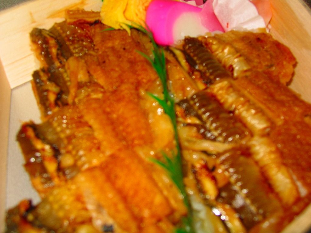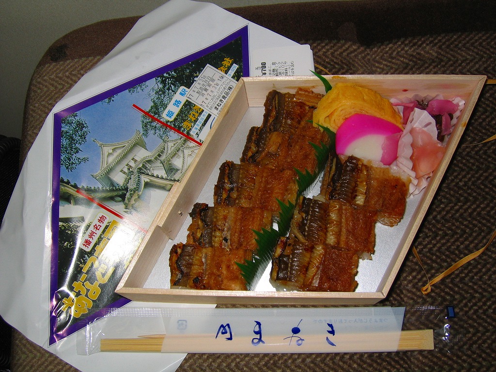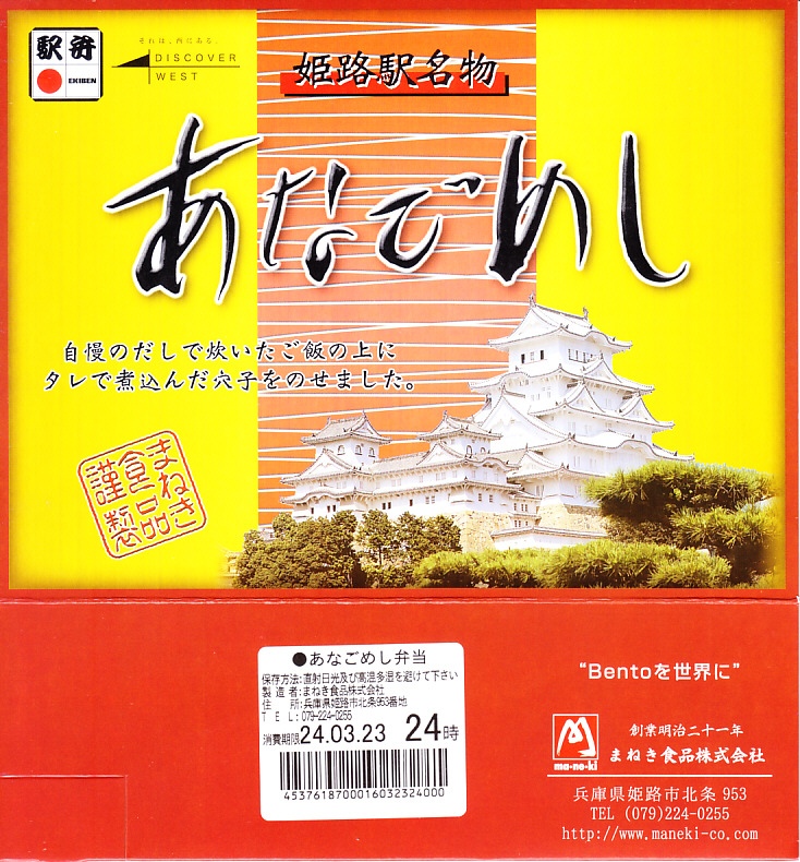 2013(平成25)年1月の京王百貨店の駅弁大会で、姫路駅の駅弁として実演販売されていたお弁当。出汁飯に刻み海苔と錦糸卵を敷き、炭焼き風のアナゴを貼り付け、きんぴらごぼうなどを添えるもの。薄手の焼アナゴは柔らかく上品も、分量が飯にだいぶ負けている。掛紙によると調味料にもこだわったのだろうが、値段にも負けたと思う。そもそもこれは催事専用商品である可能性が高いと思う。姫路駅の本物のアナゴ駅弁はこんなものではない。他の場所で売られたという情報は、目にしていない。