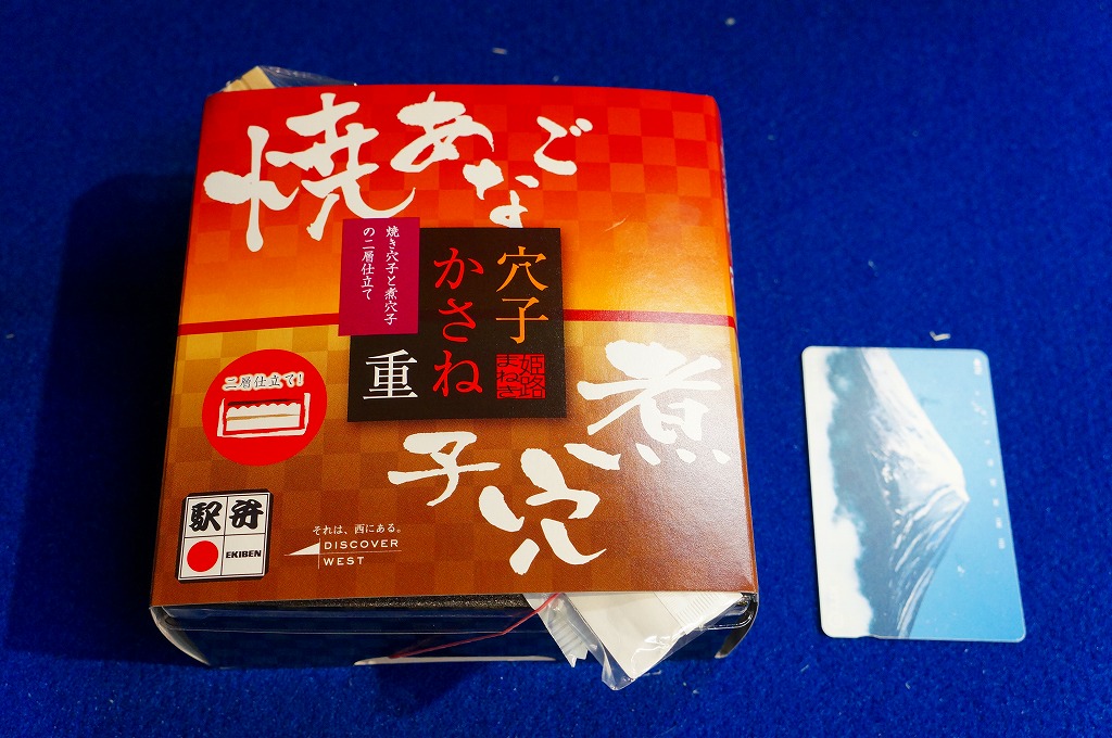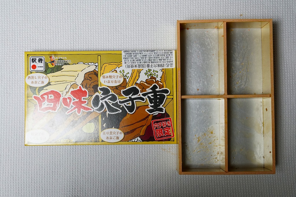 上げ底と上げ蓋で小さなカップに入る中身は少量で、御飯にはえきそばの味を感じられず、玉子焼はだいぶ甘く、硬めのアナゴは「穴子重」を名乗る量でない。現地のアナゴ駅弁はもっとうまい。確実に催事受けする商品であると思うが、味でも注目度でも、以前の陶器の姫路城のほうが良かったような気がした。年内で終売か。