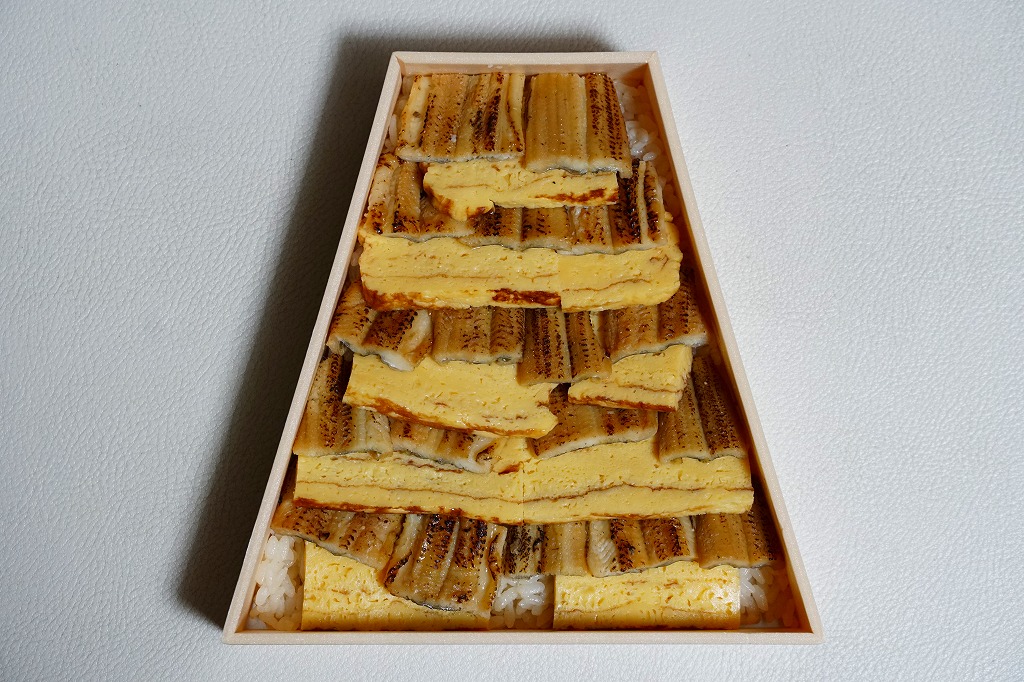 1959(昭和34)年に発売し、昭和50年代に現在の姿へ変更。細長いボール紙の容器の中に細長い穴子寿司が横たわる。椎茸と山椒の煮物を入れた、ほんのり酸っぱい酢飯と香ばしいタレと軽くお焦げが付くまでしっかり焼いた穴子蒲焼が口の中でぴったり合う。購入時は高く感じる価格にも納得。価格は2001年12月の購入時で1,200円、2010年時点で1,300円、2014年時点で1,350円、今回2017年1月の購入時で1,800円、2025年時点で1,850円。