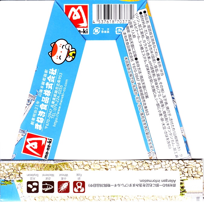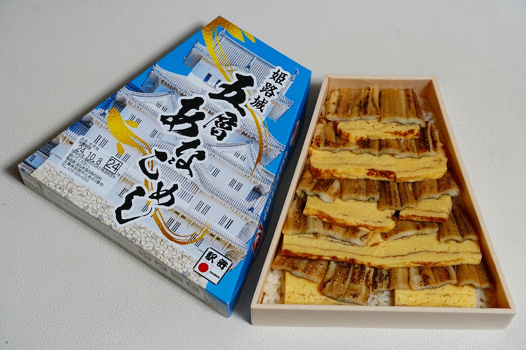 秋冬の駅弁大会シーズンに向けた、2024(令和6)年10月の新商品。同月のJR東日本の駅弁キャンペーン「駅弁味の陣2024」にエントリーし、姫路駅や東京駅や全国各地のスーパーで発売。ふたには姫路城の白い大天守を描き、これに合わせて容器の形は台形に。この容器にだし飯を詰め、焼穴子と玉子焼を交互に5回ずつ敷き重ねる。蒲焼のたれと山椒を別添し、中身をこの5種に限った。五層城である国宝姫路城をイメージしたことが、誰にでも分かりやすい。下記のとおりアナゴが得意な姫路駅弁なので、身に加えて玉子の追加で柔らかい味もいけて、なかなかの値段でその分量もしっかり。容器にこだわるよりシンプルに、名城が表現された。