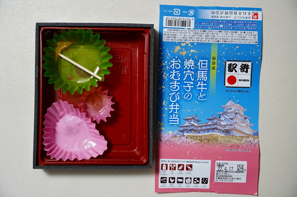 浅く平たいプラ容器に、白い姫路城が青空にまぶしい絵柄の掛紙を巻く。中身は三角柱の側部を海苔で巻いた、但馬牛煮と、焼穴子でなくシイタケ煮のおむすびが各1個に、つくね団子、ふきとニンジンの煮物、玉子焼、あさり佃煮、紅白なます、焼サワラ、焼アナゴなど。おにぎり、おむすびの記念駅弁なのに、その主役だけが情けない姿をしていて、おにぎり弁当らしからぬ充実したおかずでカバー。日本鉄道構内営業中央会の見本写真では、焼穴子おにぎりや倍量の牛肉が載るおにぎりの見栄えがしており、発売1週間で減量したか、これは輸送販売バージョンなのか。