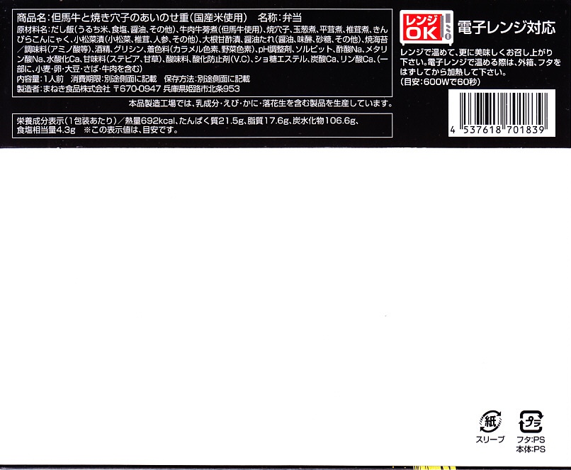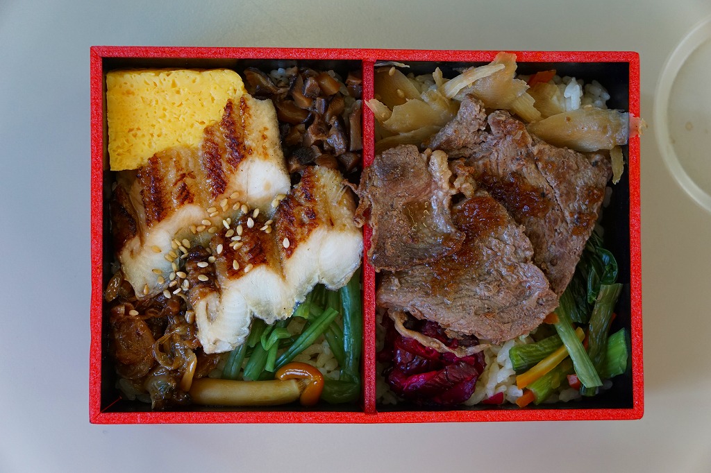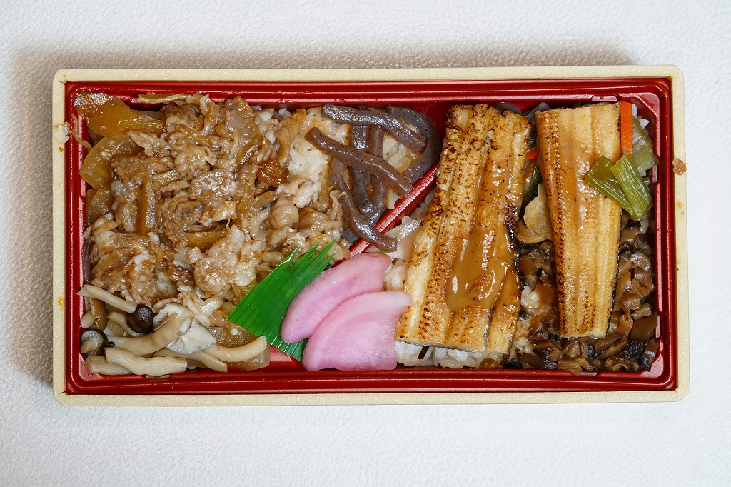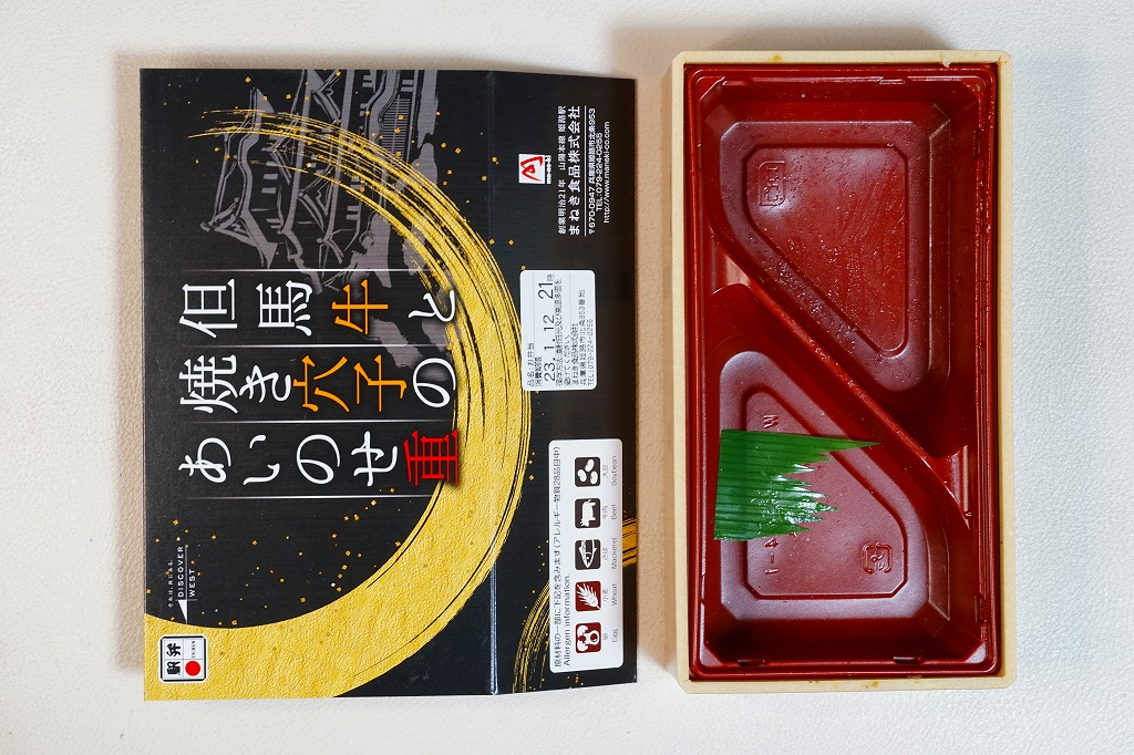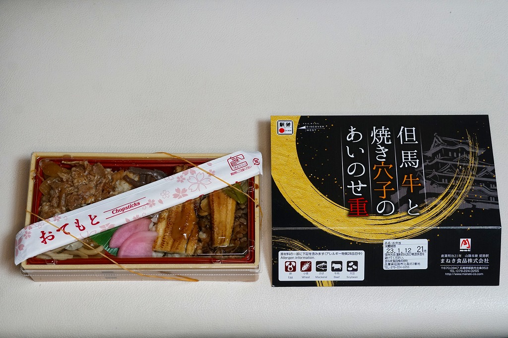 2020(令和4)年1月の京王百貨店や阪神百貨店の駅弁大会で発売。長方形の容器2区画にだし飯を詰め、一方を但馬牛とごぼうの煮物、タマネギ炒め、こんにゃく、ひらたけで覆い、他方を焼穴子、椎茸煮の刻み、小松菜漬、大根甘酢で覆う。つまり小さな牛丼とアナゴ丼が半分ずつ。牛肉でも穴子でもない具と味が強めなのは、邪魔なのか変化なのか。