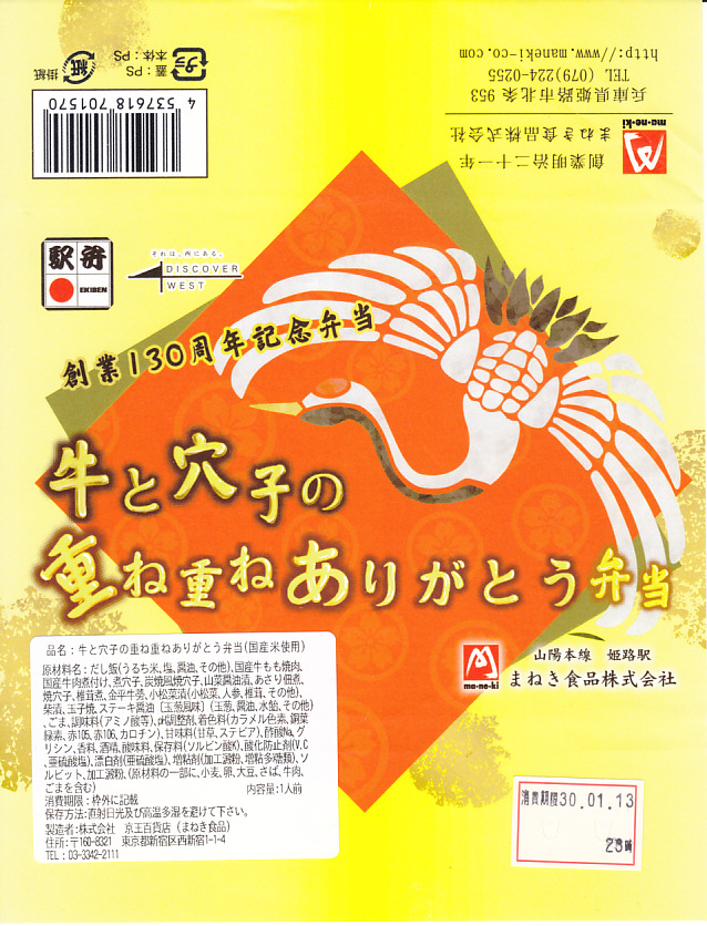 2018(平成30)年1月の京王百貨店の駅弁大会で実演販売。そのために用意した新商品だろうが、掛紙に「創業130周年記念弁当」とあるとおり、調製元の創業周年記念商品にも見える。今までのこの百貨店のこの会場のこの催事で実演販売された駅弁「穴子かさね重」の、別バージョンのような感じ。