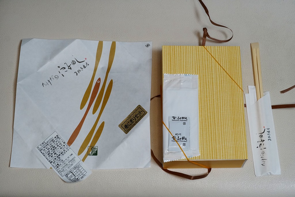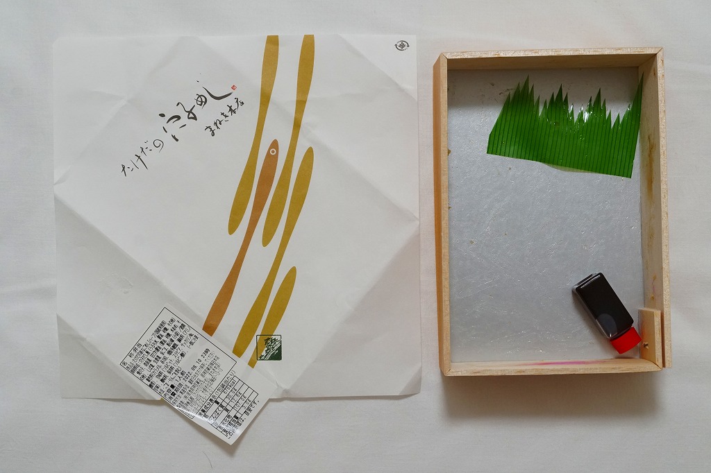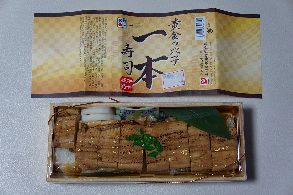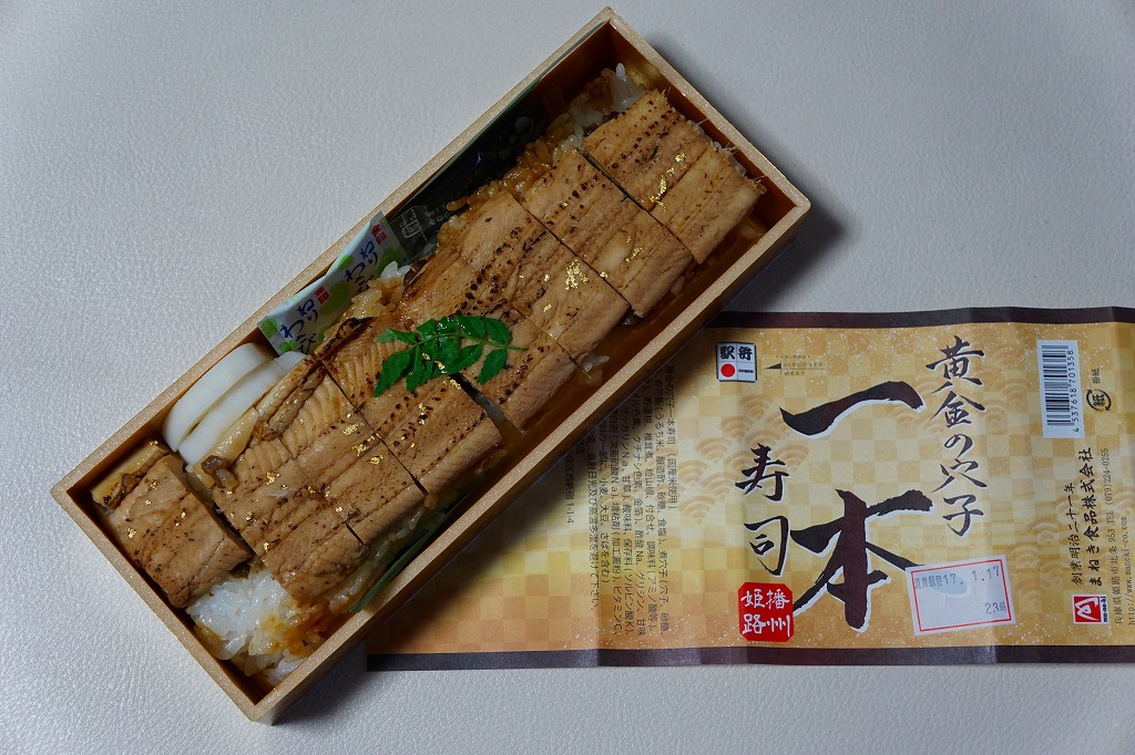 2017(平成29)年1月の京王百貨店の駅弁大会でデビューか。目玉の駅弁対決の二番手「海の幸黄金の弁当対決」として、西明石駅、福井駅、京都駅の駅弁と、実演販売で対決した。細長い容器に、アナゴの棒寿司を一本、シイタケ煮を挟んで、8切れにカットして、金粉をふりかけて、タレとワサビとダイコンを添えて、笹の葉の上に置く。中身はつまり、姫路駅弁の隠れた名作「名代あなご寿司」と、だいたい同じもの。今回買ったものは、見た目にふんわり柔らかそうで、食べたらそうでもなし。
