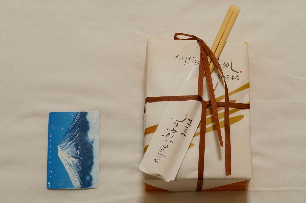 四角い容器に、兵庫米きぬむすめを使う穴子だし飯を詰め、煮穴子で覆い、奈良漬と柴漬けと生姜を添える。アナゴは柔らかくも固くもない、かまぼこのような弾力感。「たけだ」は、1888(明治21)年に調製元を創業し、現在は6代目の竹田家にちなむものだと思われる。価格は発売時や2021年の購入時で1,782円、2022年時点で1,998円、2025年時点で2,160円。