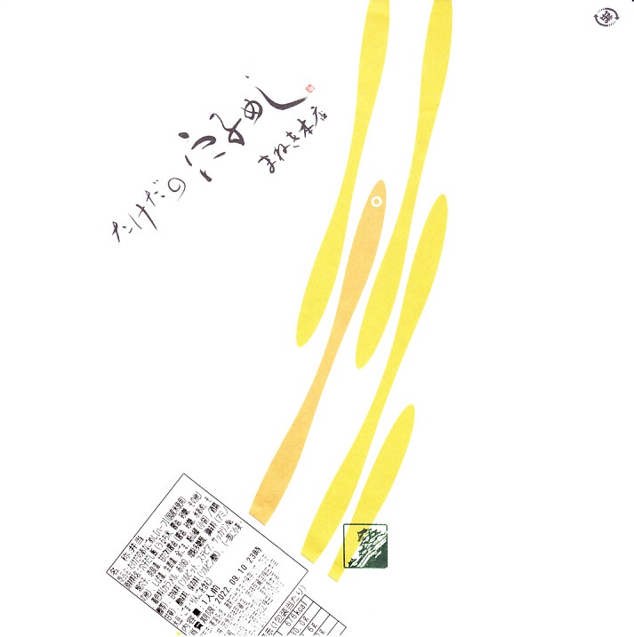 入手状況から1994(平成6)年10月20日の調製と思われる、昔の姫路駅弁の掛紙の一部。四半世紀後の同じ名前と中身の駅弁に、この文字と絵柄がそのまま使われる。