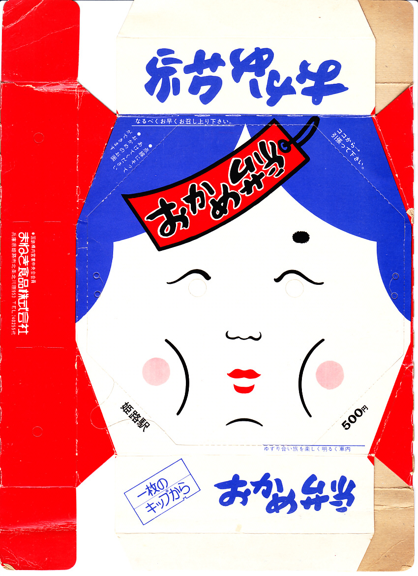 1977(昭和52)年頃の調製と思われる、昔の姫路駅弁の外箱。おかめのお面を引き出せるようになっていた。