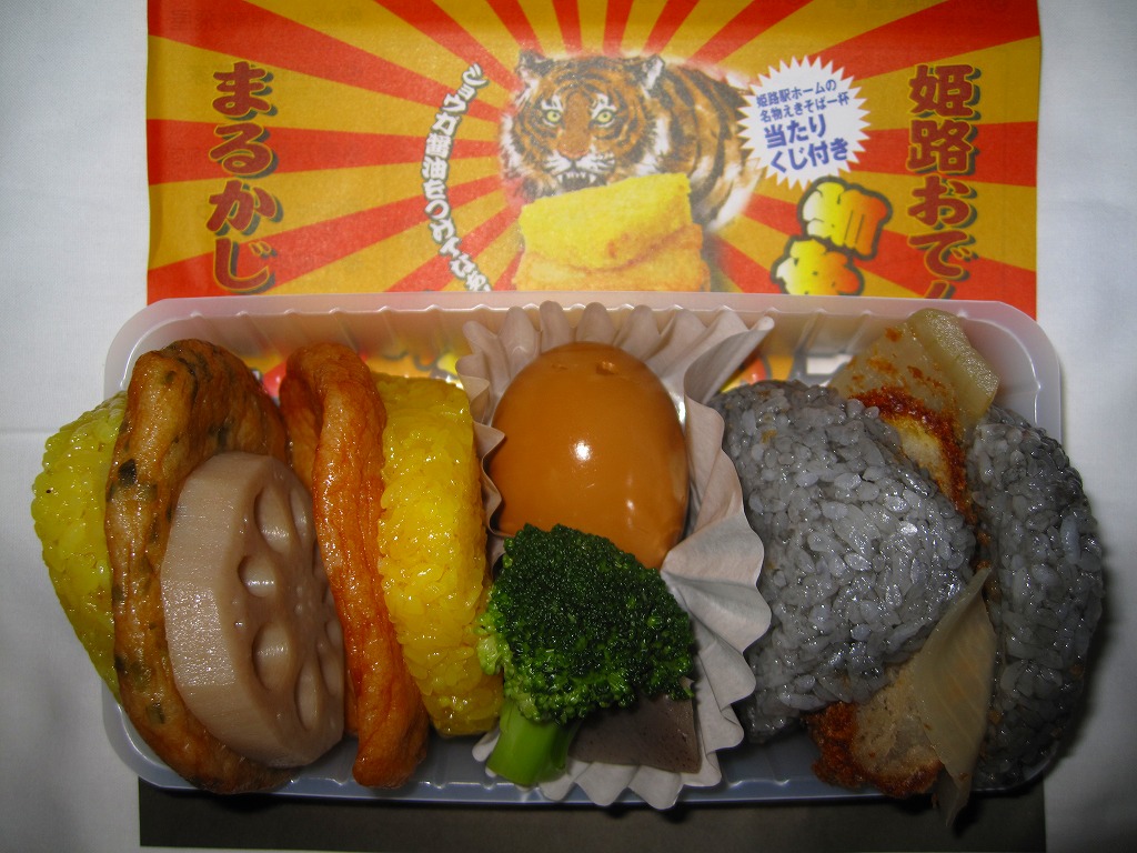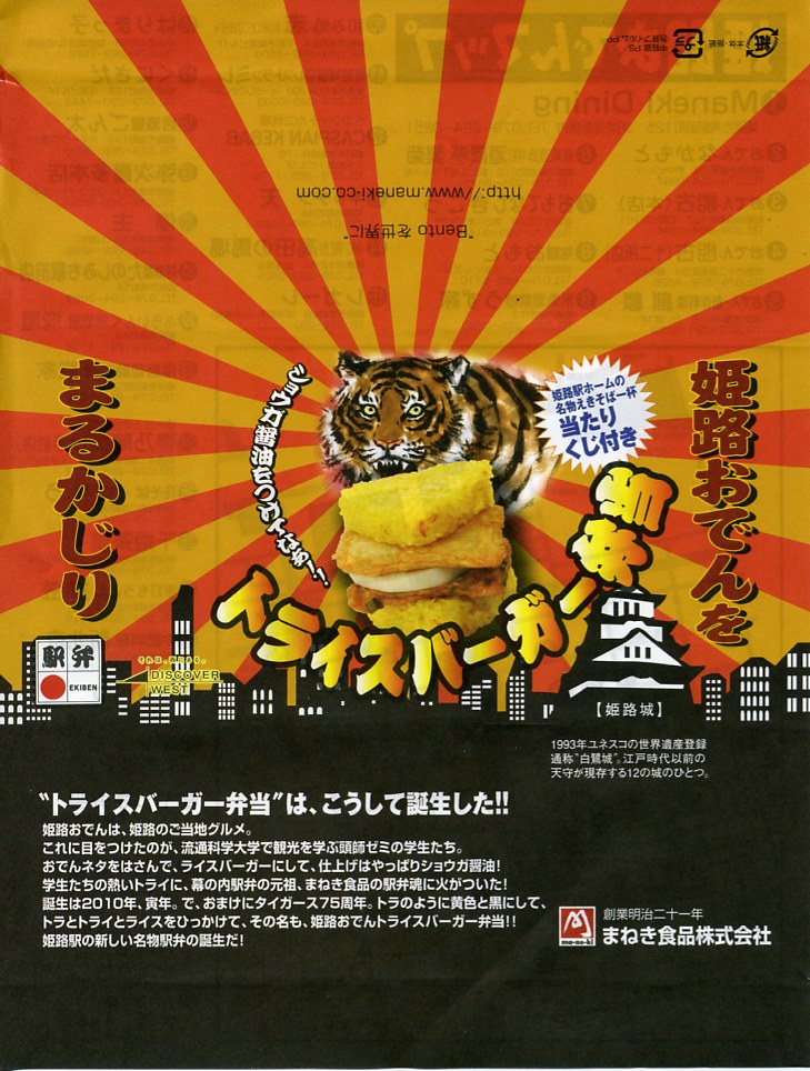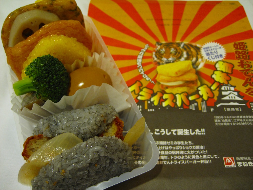 2006年から地域ブランドとして売り込み中の姫路おでん。姫路城大天守保存修理事業に伴い2010年4月から2014年度まで続く見込みの見学中止により観光客の減少が懸念される姫路で、これを新たな観光資源にしようというコンセプトで、この弁当は開発されたそうな。商品名にはトラとトライとライスバーガーを合わせたという。