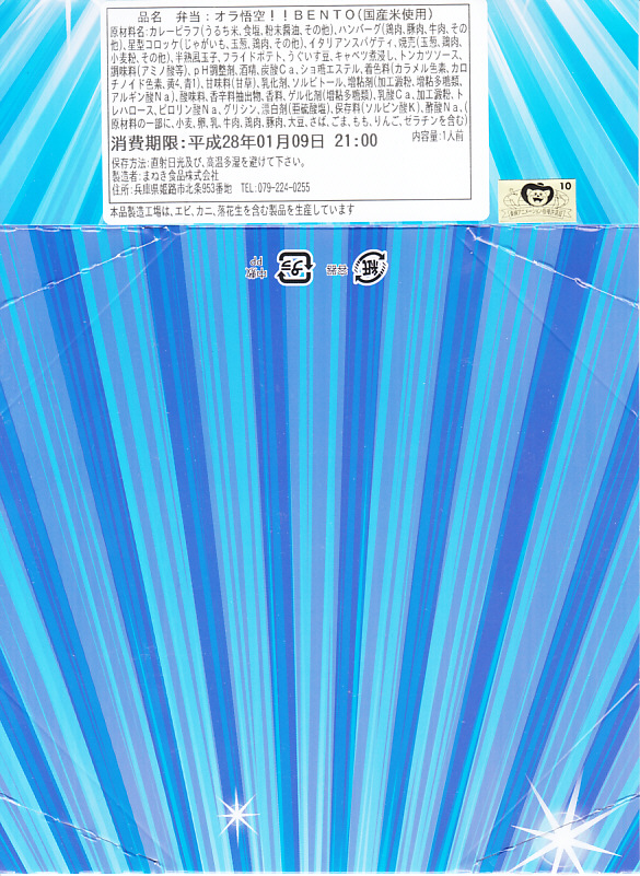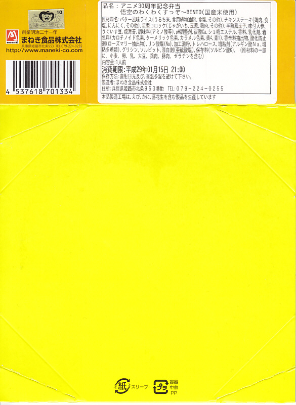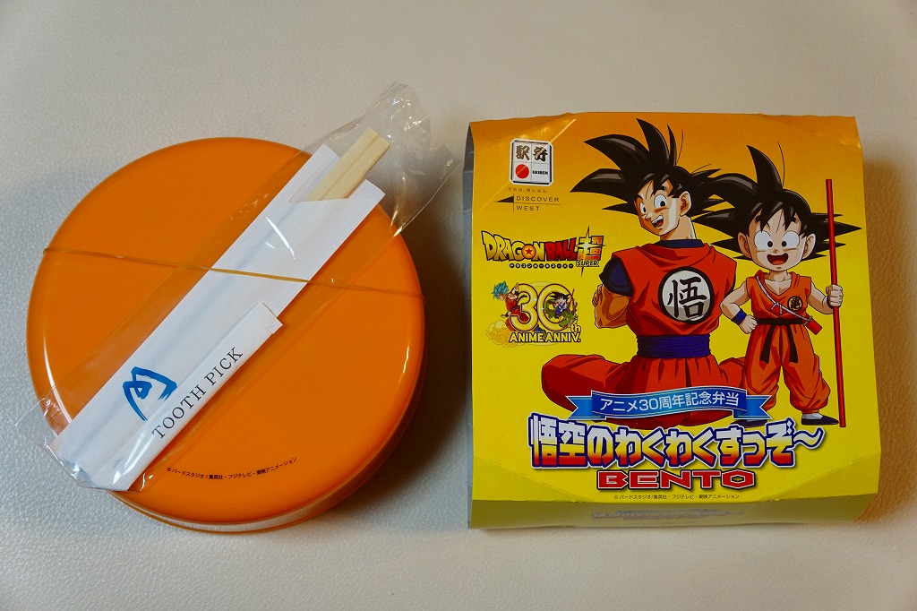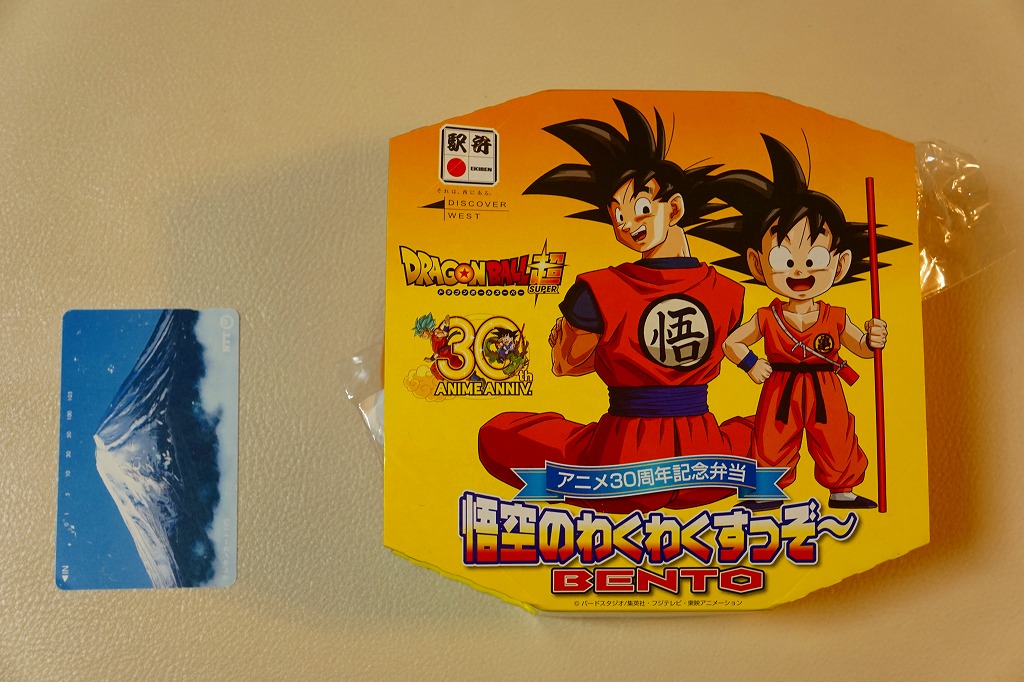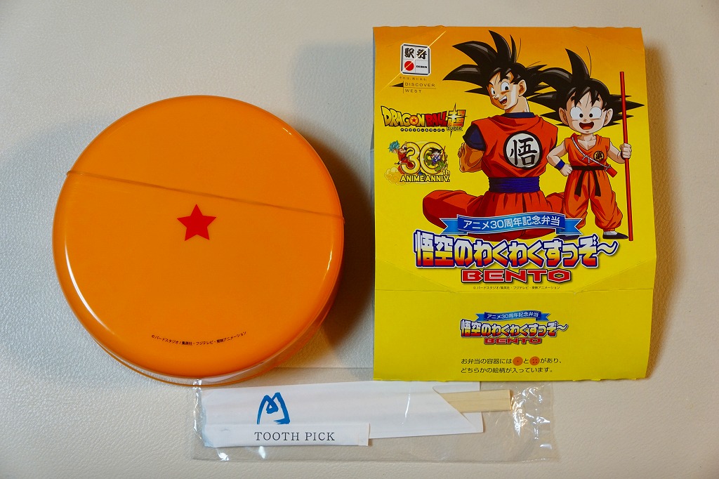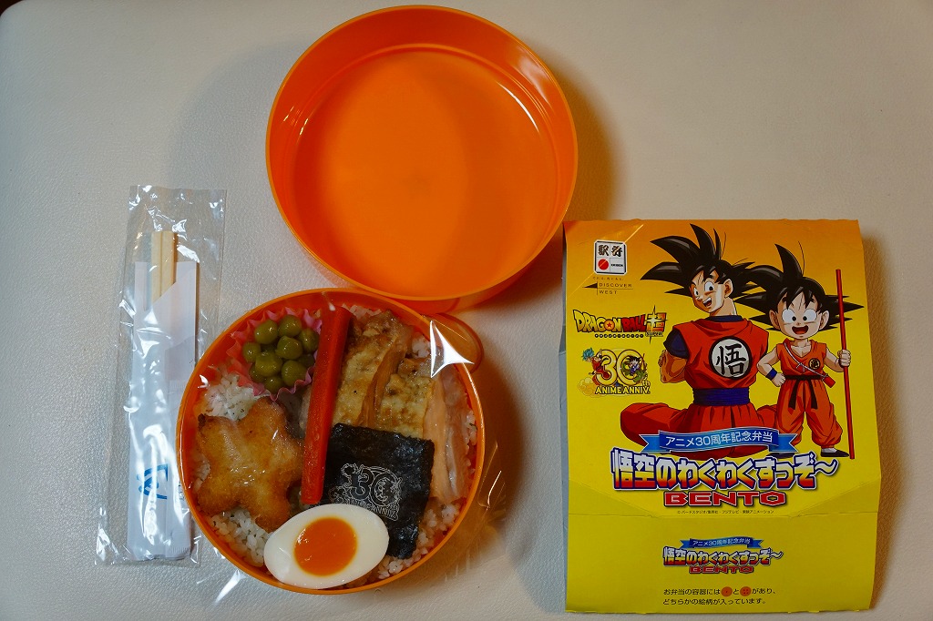 「アニメ30周年記念弁当」の副題が見えるが、テレビアニメ「ドラゴンボール」の放映開始は1986(昭和61)年2月だそうなので、駅弁の登場は1年近く遅れている感じ。このアニメが正規版や海賊版で40か国とも80か国とも言われるエリアへ広がり、世界的なアニメやキャラクターとなっている。「わくわくすっぞ〜」は、アニメやマンガで主人公の孫悟空がよく発言するセリフから。