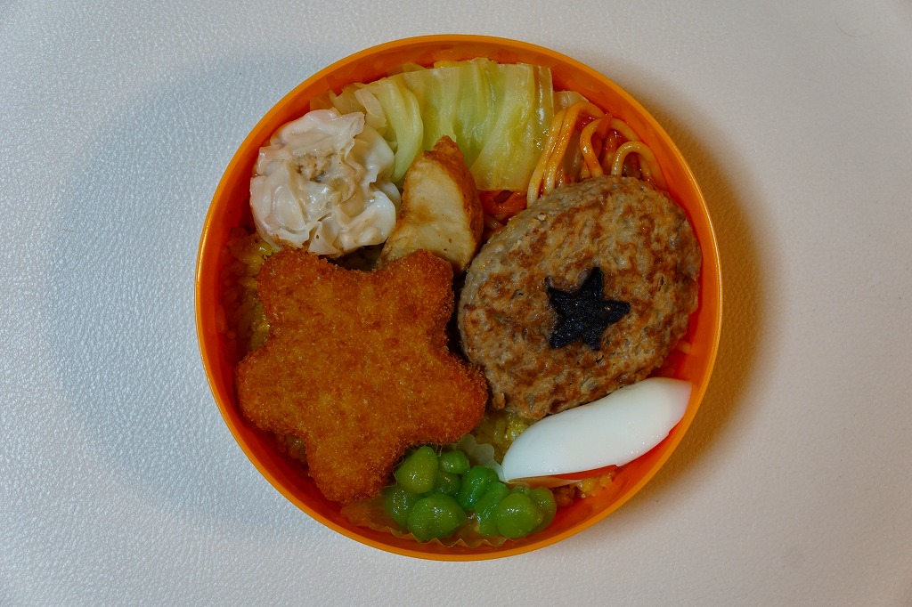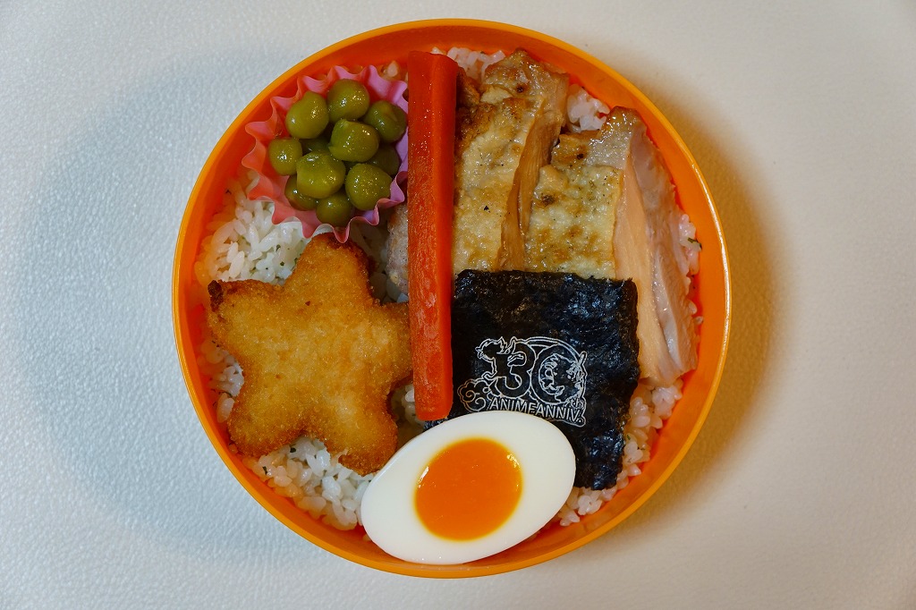 中身は、バター風味ライスの上に、チキンステーキ2切れ、星形コロッケ、半熟風玉子、ニンジン、うぐいす豆、海苔1枚。前作が少し大人に成長したような感じ。今回の容器は一星球で、パッケージの記載によると四星球か一星球のいずれかが入る模様。2017年内までの販売か。