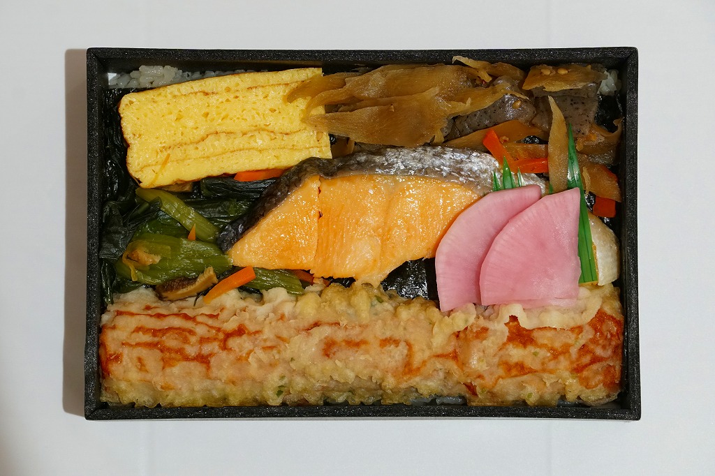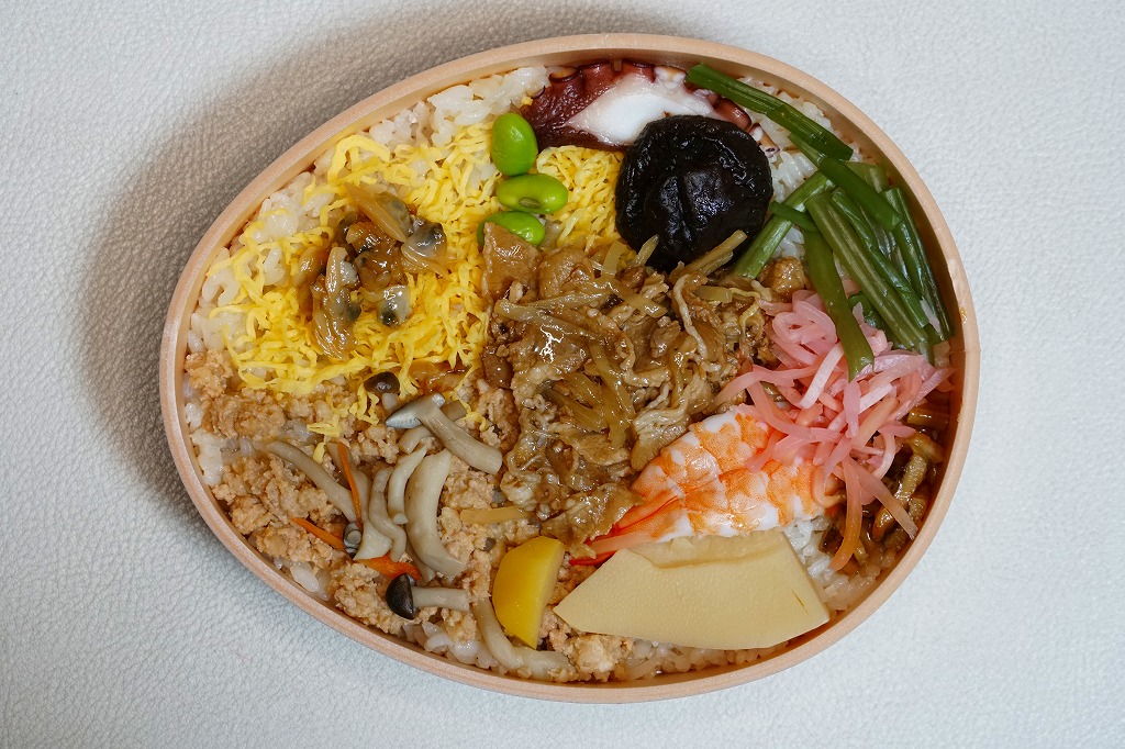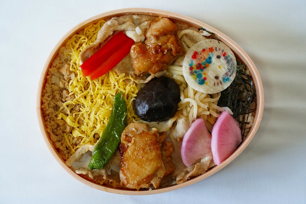 この容器に出汁飯を詰め、鶏照焼、豚しょうが焼、鶏そぼろ、錦糸卵、生姜、刻み海苔、しいたけ、ししとう、大根桜漬などで覆う。あちらのおかめ弁当と同じく、中身だけを見れば、キャラクターの世界観やかわいらしさに子供やファミリー向けの要素などまるでない、コンセプトを見いだしにくい肉と飯のお弁当。腹には溜まりそう。2024年までの販売か。