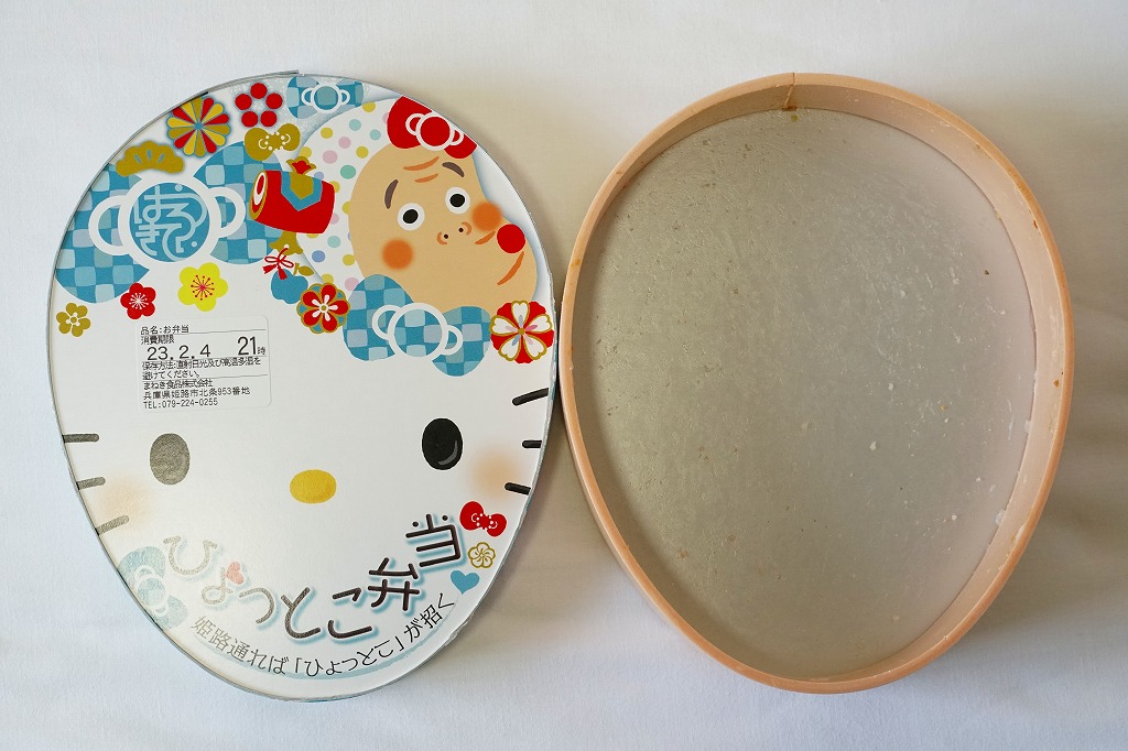 秋冬の駅弁大会シーズンに向けた、2021(令和3)年秋の新商品か。姫路駅で半世紀近い歴史を持つ駅弁「おかめ弁当」の、現在の卵形の容器のふたを、サンリオのキャラクター「ハローキティ」の顔のような絵柄にした「おかめ弁当」に対して、こちらは姫路駅弁で約40年ぶりの名前となる「ひょっとこ」。おかめ弁当と同じ卵形の容器に描くハローキティの顔を天地逆に使い青くして、こちらは男の子を表現か。ハローキティのキャラクターには、男の子のボーイフレンド「ダニエル・スター」という追加設定がある。