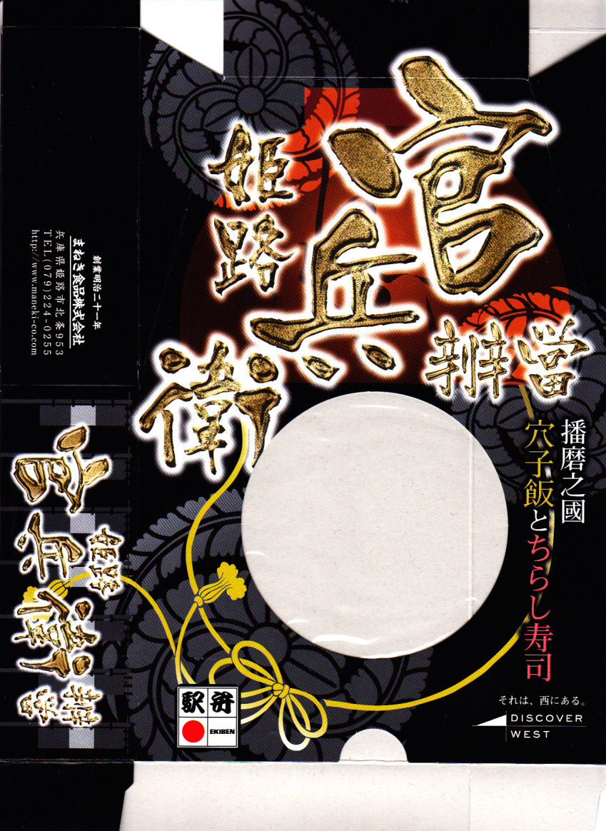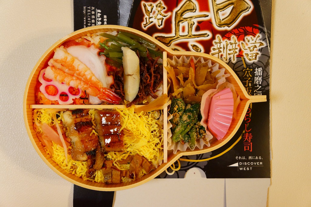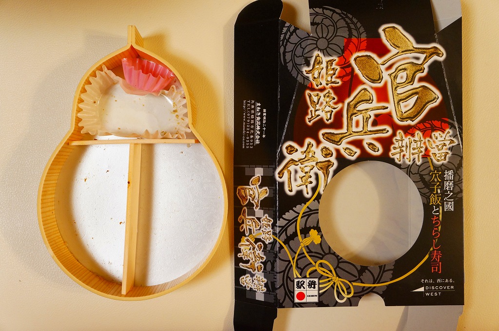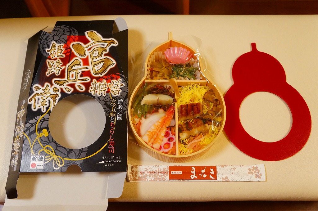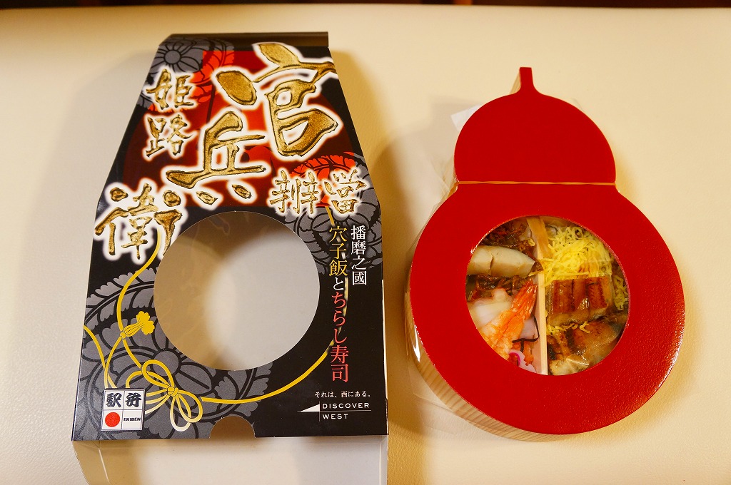 2014(平成26)年のNHKの大河ドラマ「軍師官兵衛」(ぐんしかんべえ)の放送に合わせて、前年2013(平成25)年の8月から2014年12月まで販売された期間限定駅弁。もしかすると、半年ほど早く売り止めたかもしれない。ひょうたん(ひさご)型の容器の3区画にそれぞれ、アナゴ飯、ちらし寿司、菜の花ごま和えときんぴらごぼうを詰めている。アナゴ飯は焼きアナゴもだし飯もたっぷり、ちらし寿司もタコにエビにサバにと具がちょっと豪華で、一食分には重いかなと思うくらいのボリュームがあった。