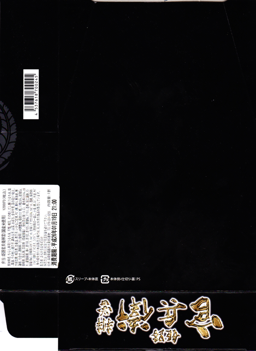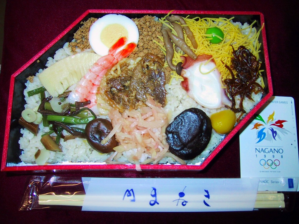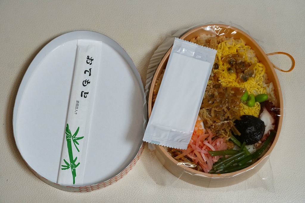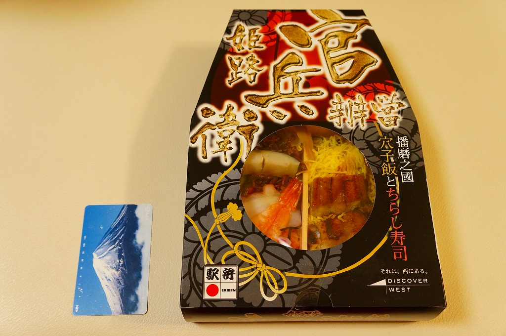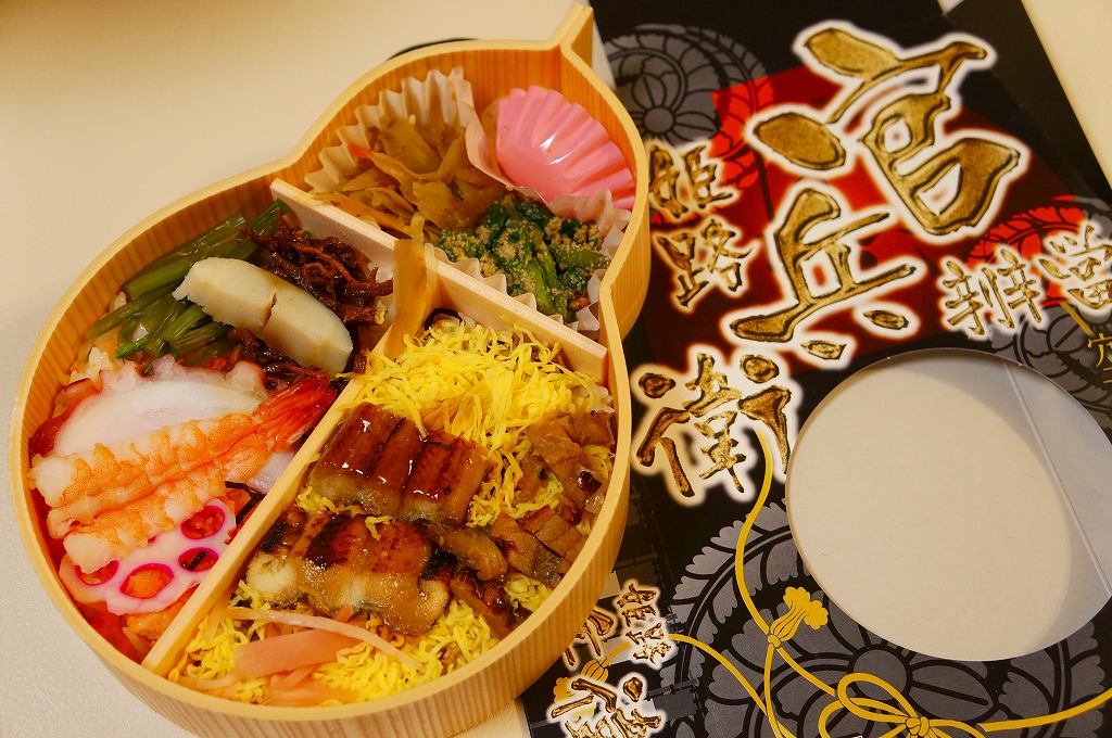 2014(平成26)年のNHKの大河ドラマ「軍師官兵衛」(ぐんしかんべえ)の放送に合わせて、前年2013(平成25)年の8月から2014年12月まで販売された期間限定駅弁。もしかすると、半年ほど早く売り止めたかもしれない。ひょうたん(ひさご)型の容器の3区画にそれぞれ、アナゴ飯、ちらし寿司、菜の花ごま和えときんぴらごぼうを詰めている。アナゴ飯は焼きアナゴもだし飯もたっぷり、ちらし寿司もタコにエビにサバにと具がちょっと豪華で、一食分には重いかなと思うくらいのボリュームがあった。