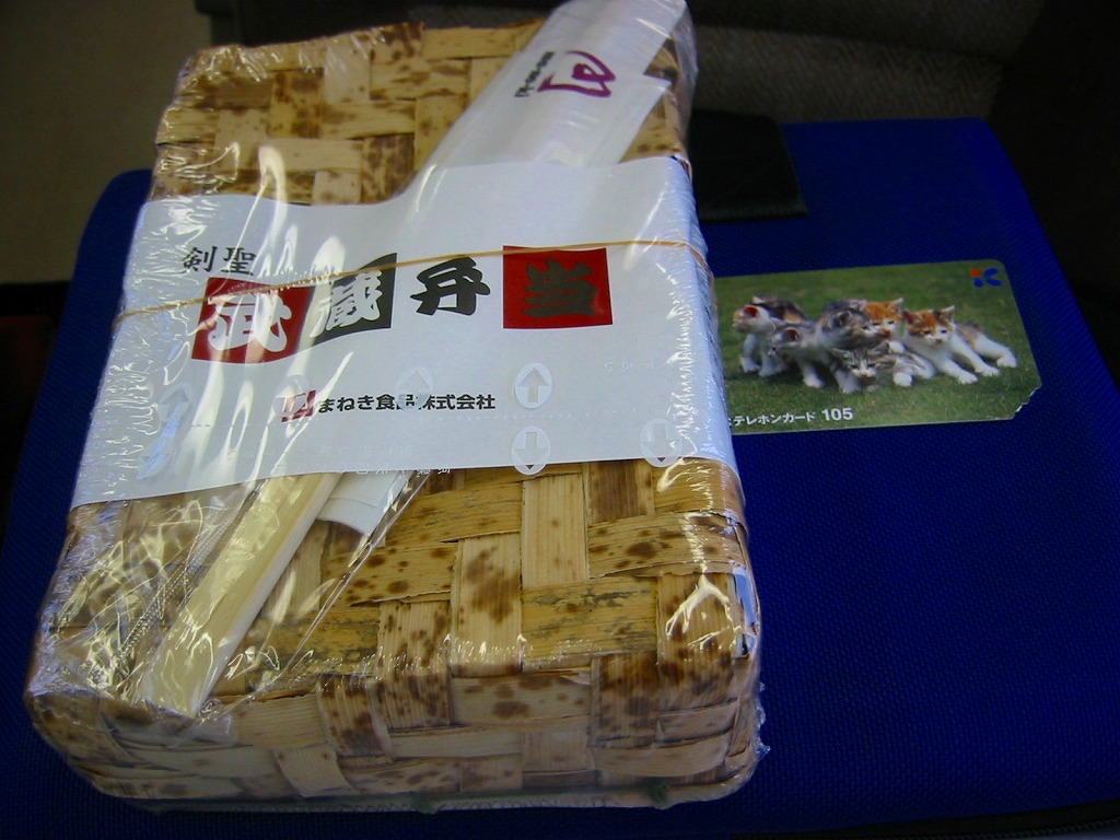 NHK大河ドラマ「武蔵MUSASHI」の放映を記念して、2002(平成14)年11月30日に発売。2001年発売の「21世紀出陣弁当」から各地の駅弁で使われ始めた竹籠容器を使用、さらに笹の葉を敷いて雰囲気を出して、中身は白飯黒胡麻の三角おにぎりがふたつと、月見玉子に焼き鳥に煮物の数々、そしてメザシを二本刺して武蔵の二刀流を表現。価格の割に中身が少ないような気はするが、雰囲気が良く売れそうな駅弁。現在は売られていない模様。