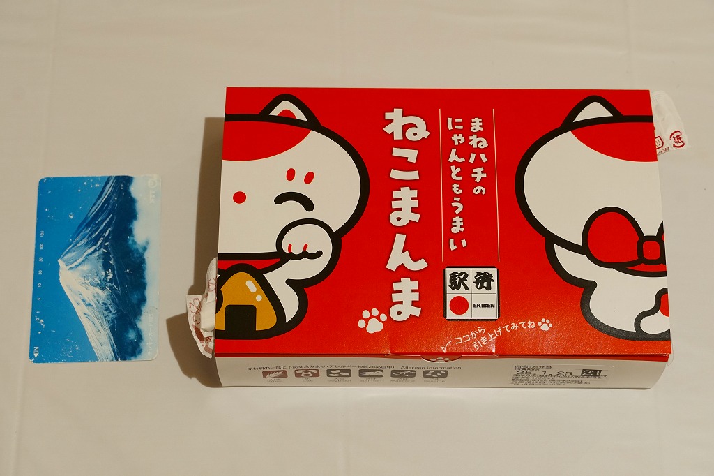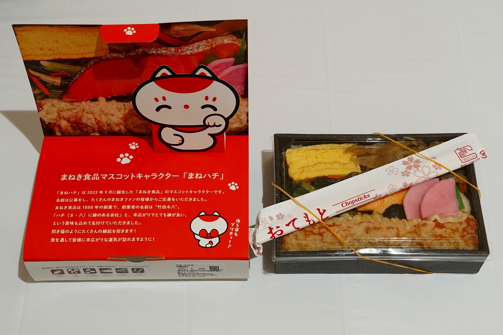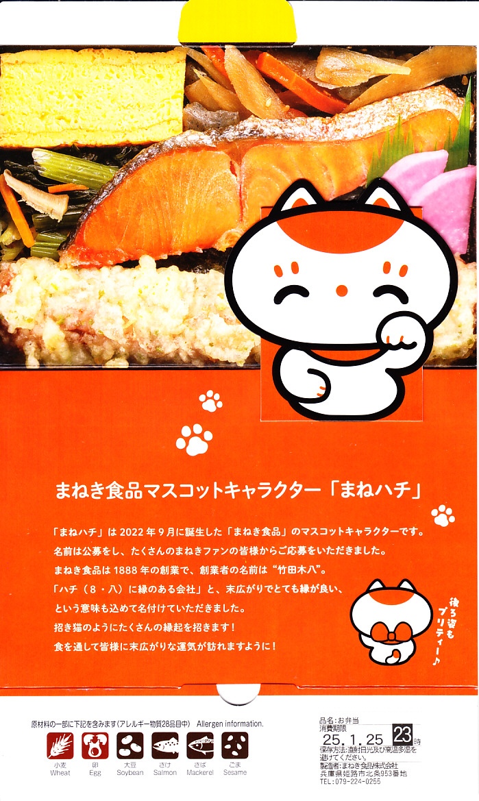 2025(令和7)年1・2月の鶴屋百貨店の駅弁大会で、姫路駅の駅弁として実演販売。スリーブに描かれるネコのキャラクター「まねハチ」は、2022年9月に誕生した調製元のマスコットキャラクターと書いてあり、他の姫路駅弁の外箱にも描かれる。浅く平たい四角形の容器にだし飯を詰め、かつおぶしと海苔で覆い、銀鮭の塩焼き、ちくわ磯部揚げ、厚焼き玉子、小松菜漬、きんぴらごぼう、甘酢大根で覆う。つまり、中身は「ねこまんま」でなく海苔弁だった。姫路や関西地方にも公式サイトなどの案内にも出てこない、駅弁大会のチラシやリストにも載らなかった、謎の商品。