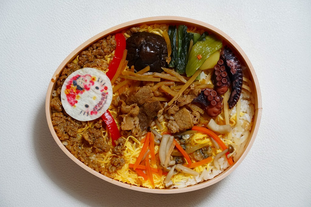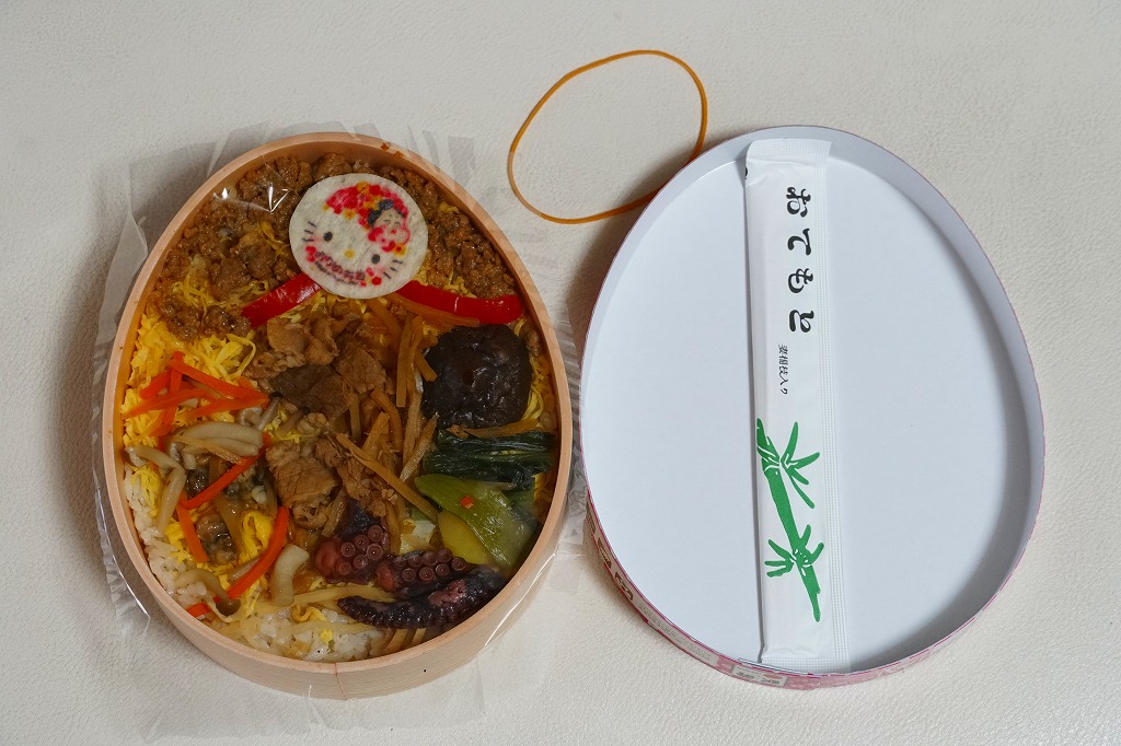 中身は普段のおかめ弁当と同じく、容器に出汁飯を詰め、牛肉煮、鶏そぼろ、きんぴらごぼう、小松菜漬、しいたけ、しめじ、タコ、錦糸卵などで覆うもの。ここでは通常版の具からエビやぎんなんや紅生姜などを抜き、ハローキティの顔を印刷した魚肉の紙を入れた。発売時に920円だった通常版との価格差280円がキャラクターの使用料か。内容の渋さとキャラクターのかわいらしさがすれ違う。2024年までの販売か。