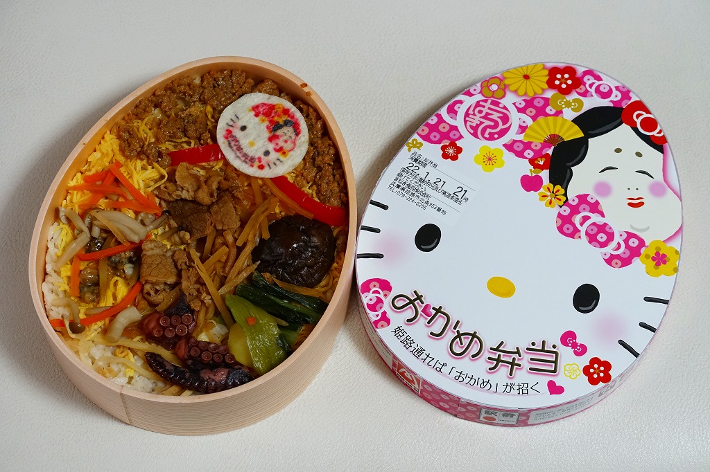 秋冬の駅弁大会シーズンに向けた、2021(令和3)年秋の新商品か。姫路駅で半世紀近い歴史を持つ駅弁「おかめ弁当」の、現在の卵形の容器のふたを、サンリオのキャラクター「ハローキティ」の顔のような絵柄にした。おかめ弁当とハローキティの生まれ年は同じ1974(昭和49)年かもしれない。