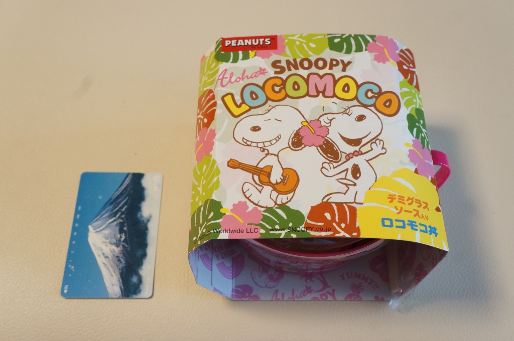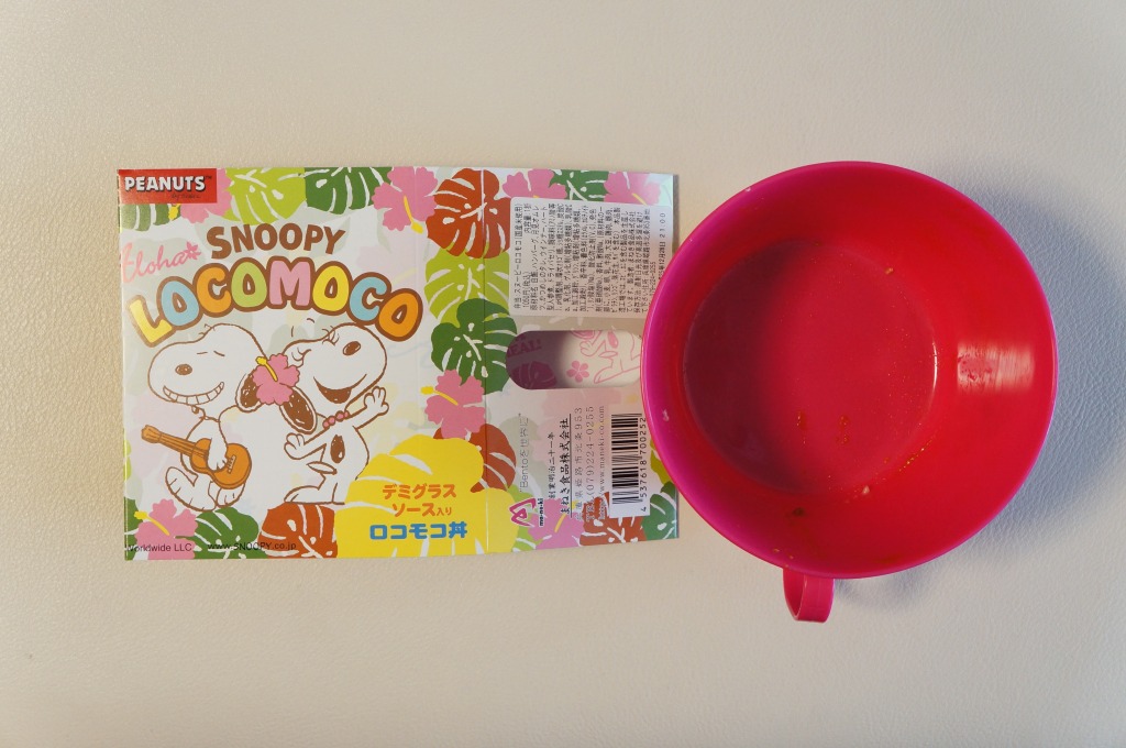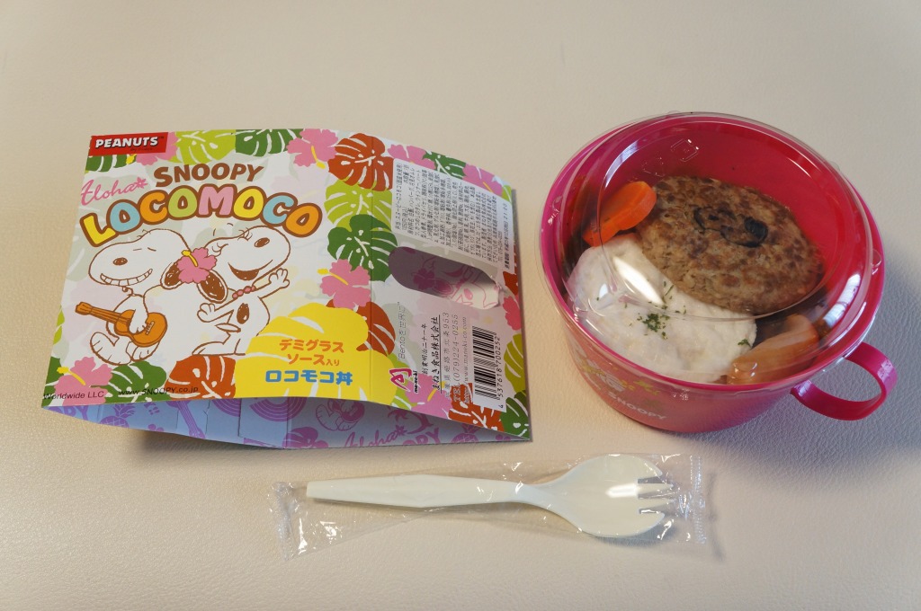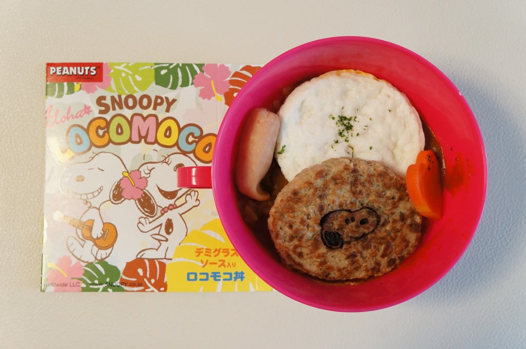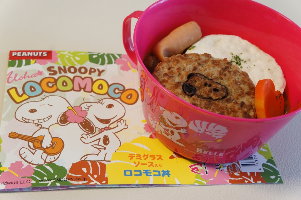 2013(平成25)年の夏頃の発売か。商品名は「スヌーピーロコモコ」とも。キャラクターが描かれたピンク色のプラ製カップに、御飯を詰めてデミグラスソースをかけて、やはりキャラクターを印刷したハンバーグ、丸い目玉焼きというかオムレツ、ソーセージ、ハート形のニンジンを載せる。
