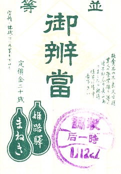 1927(昭和2)年1月13日13時の調製と思われる、昔の姫路駅弁の掛紙。上等と普通の2種類があった当時の幕の内駅弁のうち、普通のものを単に「御辨當」とせず「並等」を付けたものは、比較的珍しいと思う。この当時の近畿地方にのみ見られたと思う、名刺ほどのサイズしかない、とても小さな掛紙。