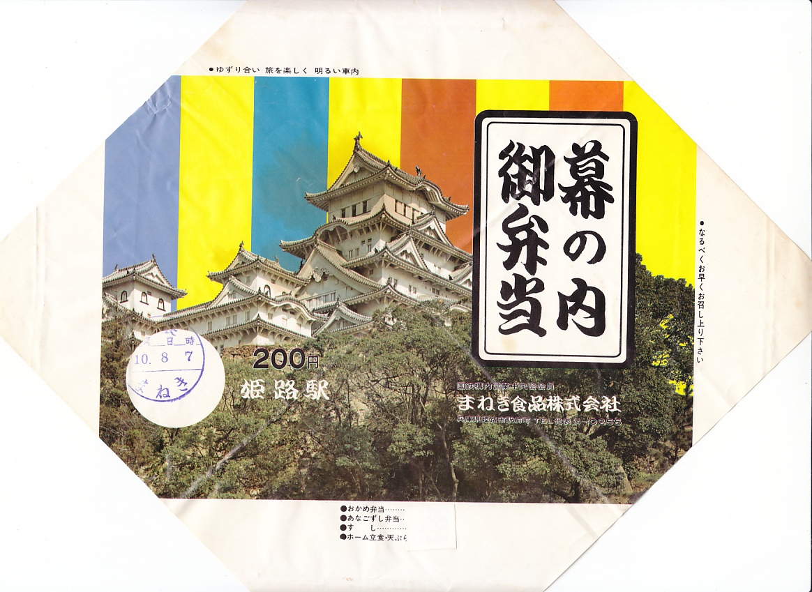 1980年代の、8月18日17時の調製と思われる、昔の姫路駅弁の掛紙。姫路城の別名「白鷺城(しらさぎじょう)」を、並等幕の内駅弁の名前にしたものだろう。姫路城天守の写真を使う。