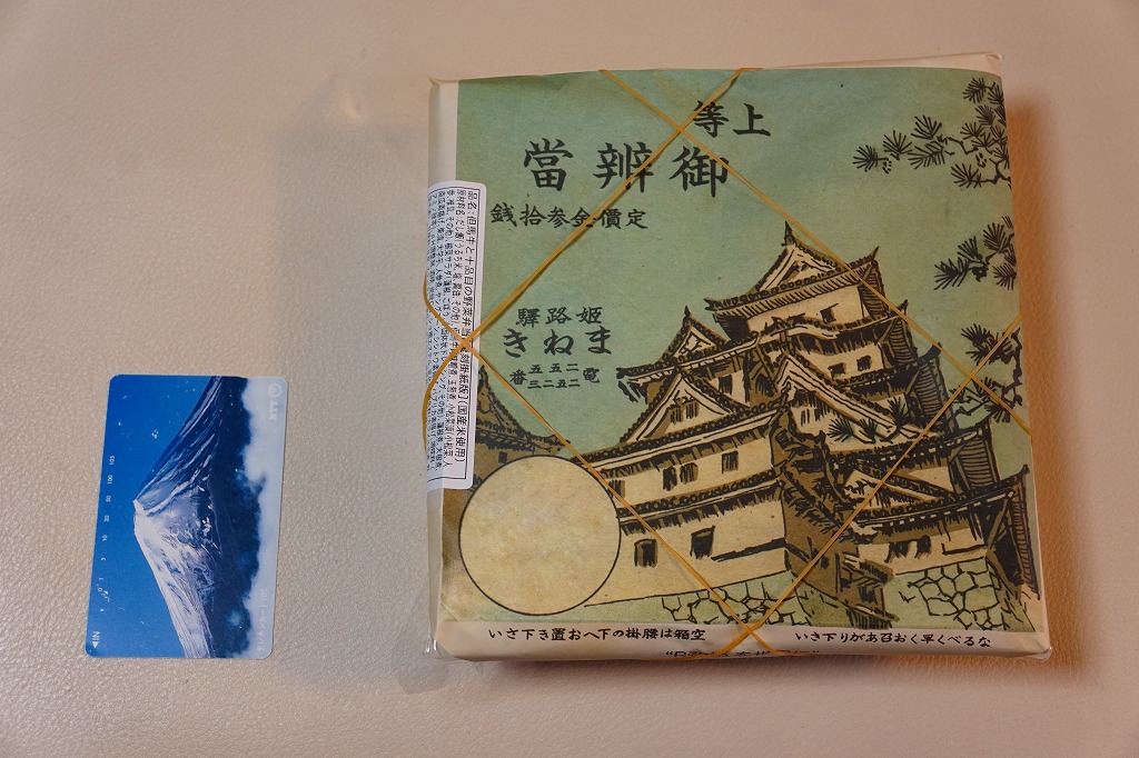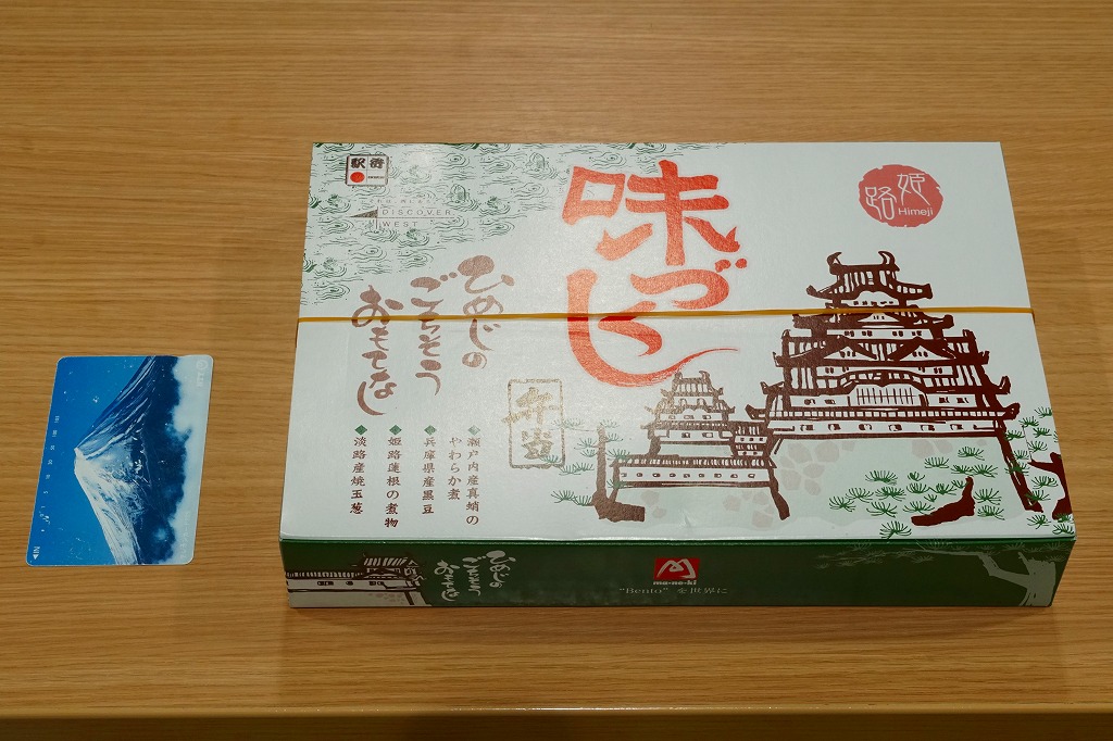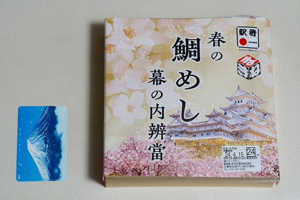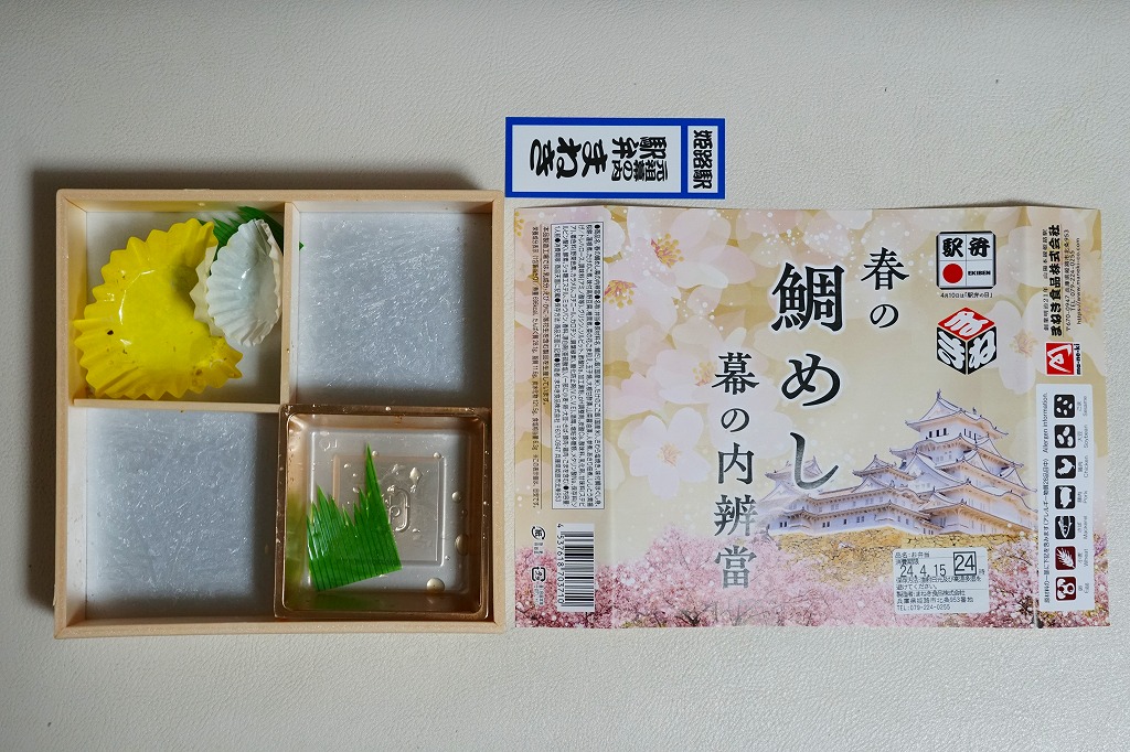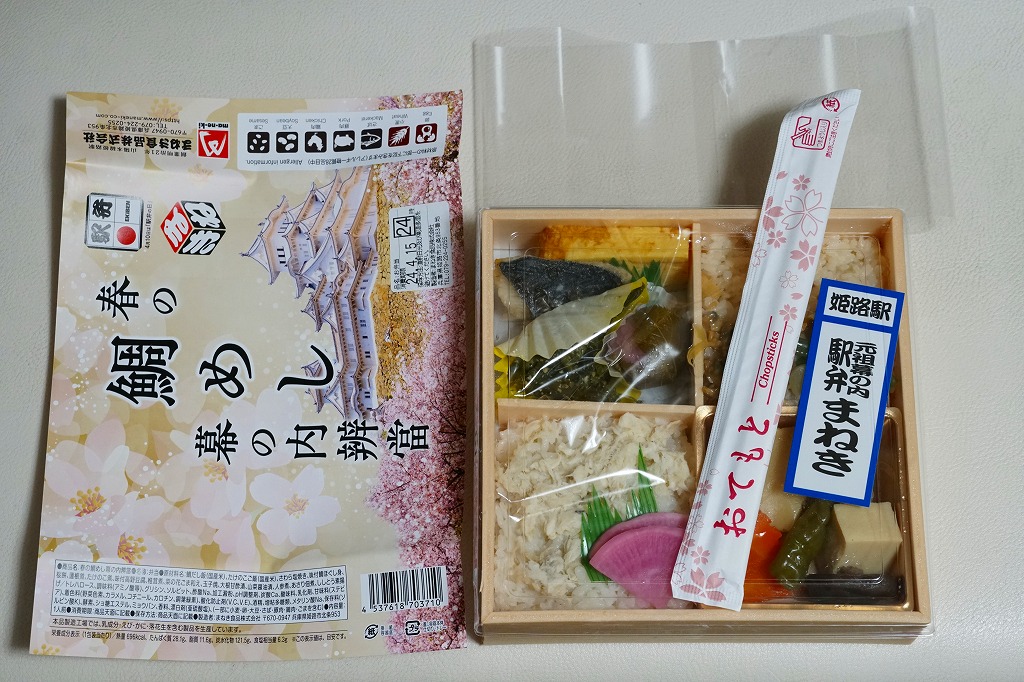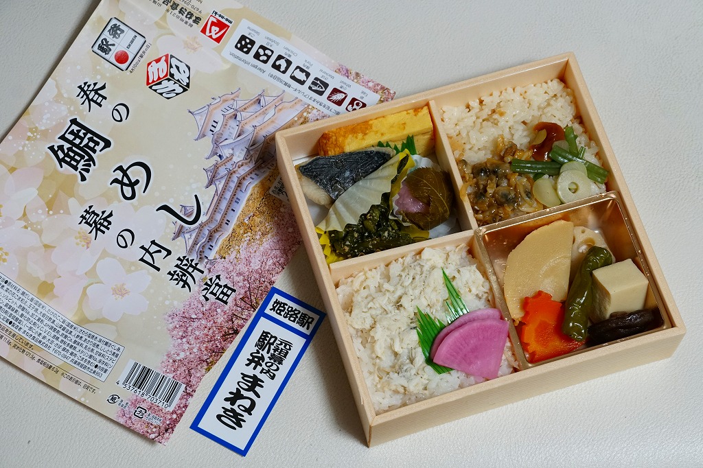 2024(令和6)年4月5日から5月5日まで、姫路、新神戸、大阪、新大阪、京都駅などで販売。駅弁の日に合わせ、日本鉄道構内営業中央会の会員のうち31社が各社おすすめ駅弁に共通ノベルティ「千社札風カード」を添付して期間限定で販売した駅弁の、姫路駅バージョン。姫路城と桜を描いた掛紙をまとう、松花堂弁当タイプの容器に、瀬戸内産真鯛の鯛めし、たけのこご飯、タケノコや姫路城型ニンジンなどの煮物、焼サワラに玉子焼と菜の花ごま和えに桜餅を詰める。おかずの多い、柔らかな鯛飯駅弁。「幕の内」の要素を感じられないが、これは姫路駅が幕の内駅弁の元祖であることを言いたい記念駅弁なのかもしれない。