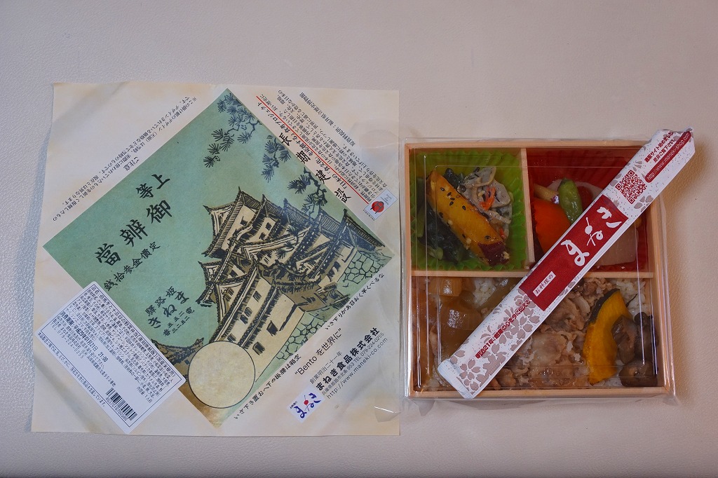 2017(平成29)年1月の京王百貨店の駅弁大会で売られた、掛紙復刻弁当。かつて姫路駅の上等幕の内駅弁で使われた掛紙を使用、福井県の駅弁催事業者のロゴマークとキャッチフレーズも記される。中身は茶飯を牛肉とカボチャとタマネギと柴漬けで覆い、ダイコンやニンジンなどの煮物と、小松菜やレンコンなどの和え物を詰める。食品表示ラベル上で品名が「但馬牛と十品目の野菜弁当」とあり、そんな名前とこんな内容のものが2014年の秋頃から駅弁催事専用商品としてあるらしい。容器と中身は貧弱。掛紙の姫路城は見事。価格は2017年の購入時で950円、「但馬牛と十品目の野菜弁当」は2019年時点で980円、2020年時点で1,000円、2023年時点で1,080円。