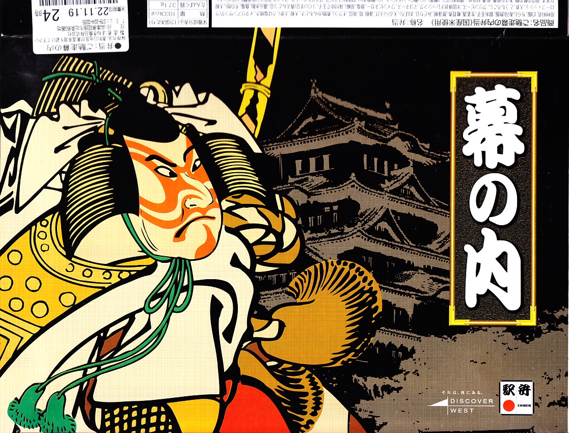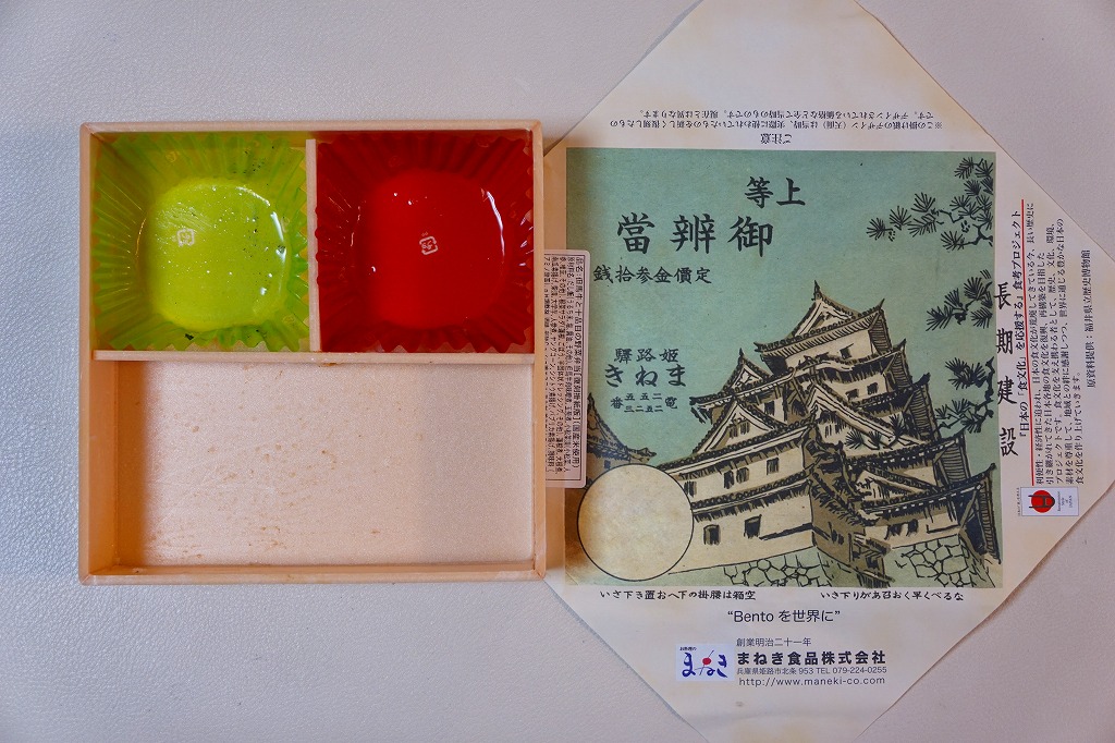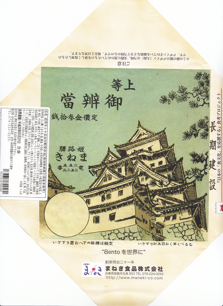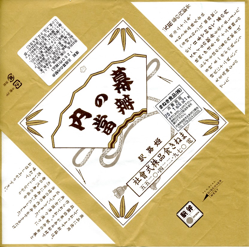 姫路駅の幕の内弁当。JR西日本の駅弁キャンペーン「駅弁の達人」の実施に伴い、2004(平成16)年5月1日に発売したとされるが、下記のとおり姫路駅の幕の内弁当は、100年以上前から売られるものである。市販の汎用品に見えて調製元の専用品である紙箱には、商品名と姫路城、簡単なおしながきに駅弁マークとJR西日本のDISCOVERWESTロゴマークを描く。