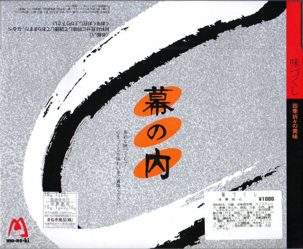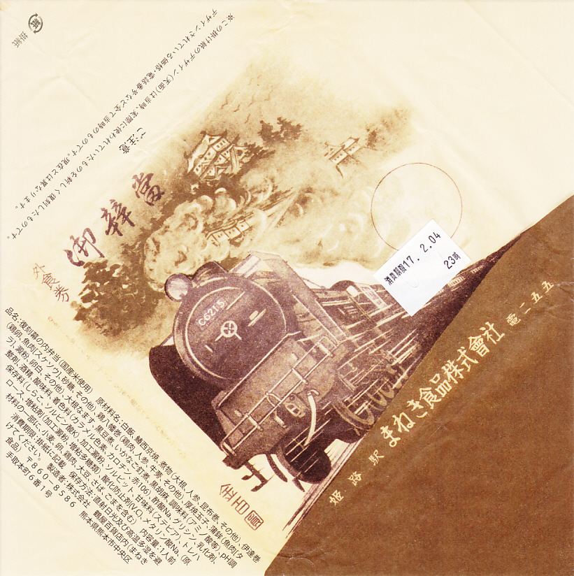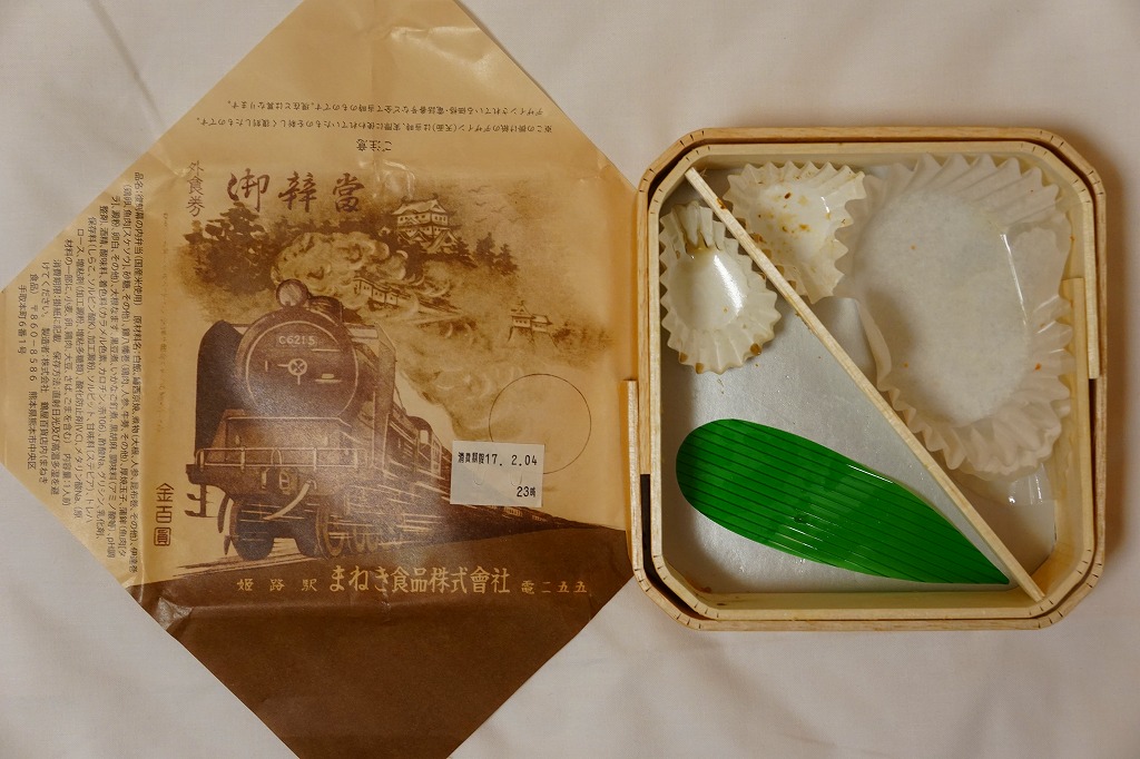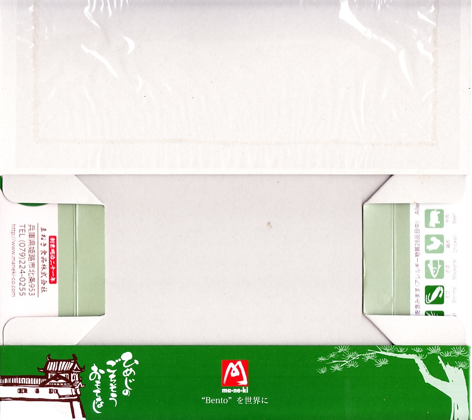 姫路駅の幕の内弁当。JR西日本の駅弁キャンペーン「駅弁の達人」の実施に伴い、2004(平成16)年5月1日に発売したとされるが、下記のとおり姫路駅の幕の内弁当は、100年以上前から売られるものである。市販の汎用品に見えて調製元の専用品である紙箱には、商品名と姫路城、簡単なおしながきに駅弁マークとJR西日本のDISCOVERWESTロゴマークを描く。