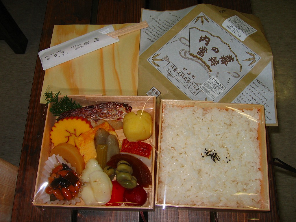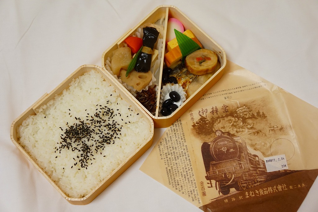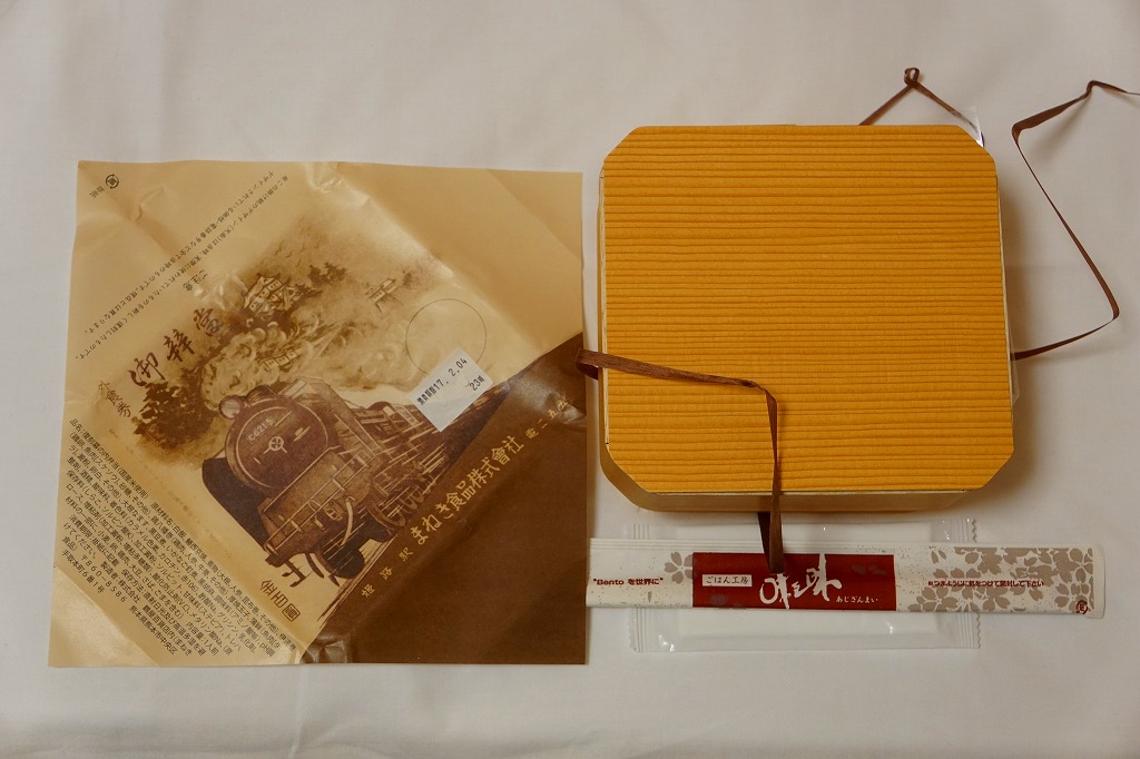 姫路駅でイベント時にときどき販売される復刻駅弁。正方形二段重ねの松製経木折に、かなり昔の駅弁掛紙デザインを取り入れた薄手の掛紙をかけて、ひもで十字にしばる。中身は下段がプレーンな白御飯、上段が鯛塩焼、伊達巻、きんとん、玉子焼、焼蒲鉾、百合根、空豆、大豆昆布、フキ、ごぼうと奈良漬や梅干など。今の駅弁にないおかずの組み合わせに、御料理弁当以上、おせち料理以下の風味と雰囲気を感じる。