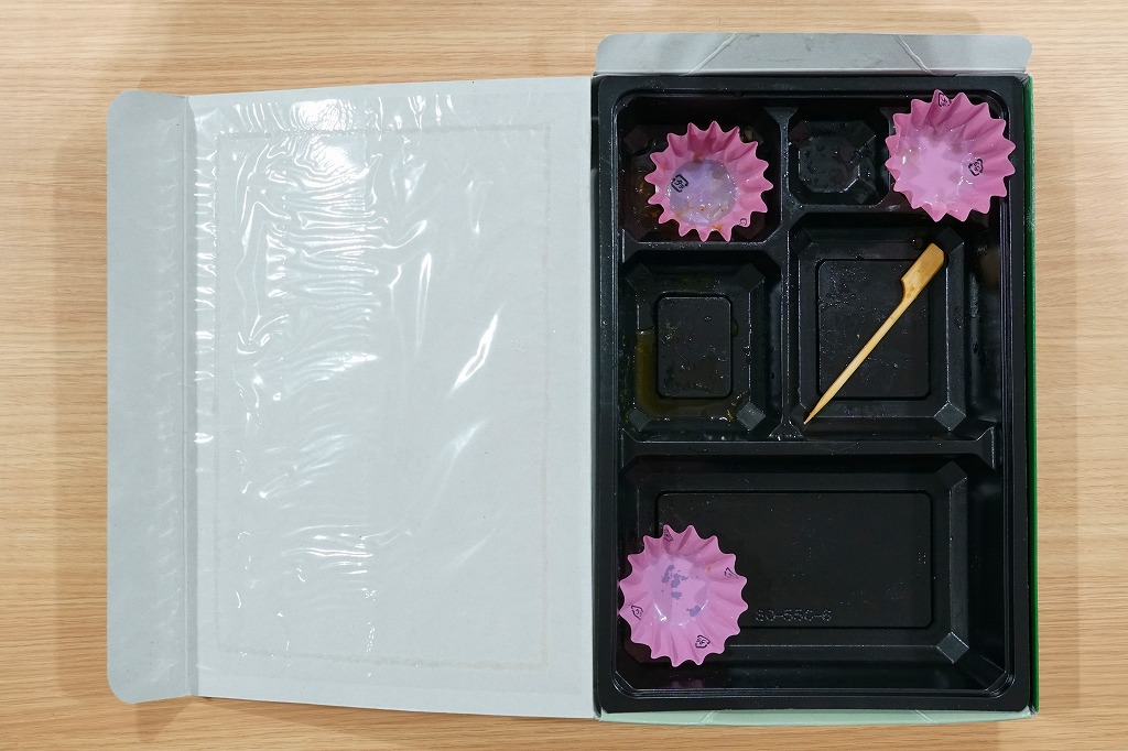黒いプラ製トレーに収めた中身は、白ごまの俵飯とたくあん、瀬戸内産真蛸のやわらか煮と姫路蓮根その他の煮物、兵庫県産黒豆、淡路産焼玉葱、サワラ西京焼、鶏もも照焼、玉子焼、牛肉とごぼうの煮物、エビの甘酢漬と大根なます、あさり佃煮、甘えび唐揚など。普段使いの幕の内駅弁、というジャンルのものは全国的にだいぶ少なくなったが、それよりはおかずが充実していると思う、お料理弁当。価格は2004年時点で1,000円、2014年時点で1,050円、2019年時点で1,080円、2022年時点で1,150円。