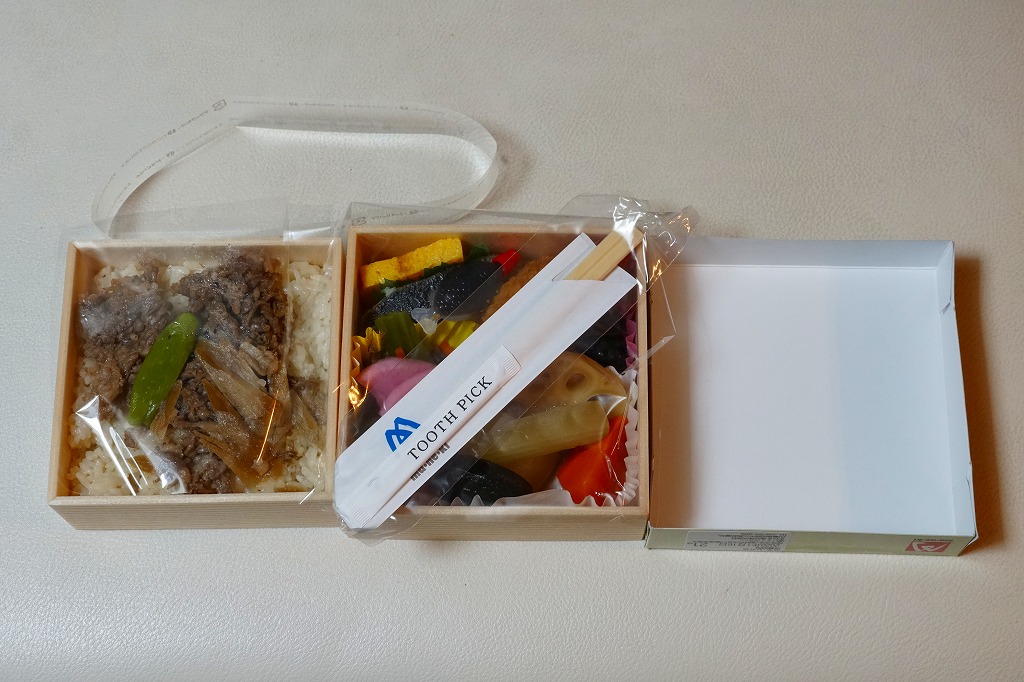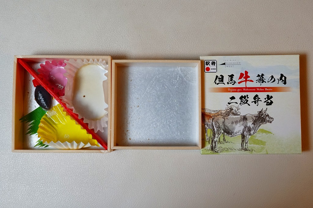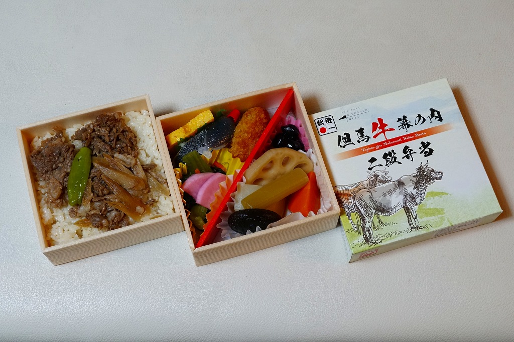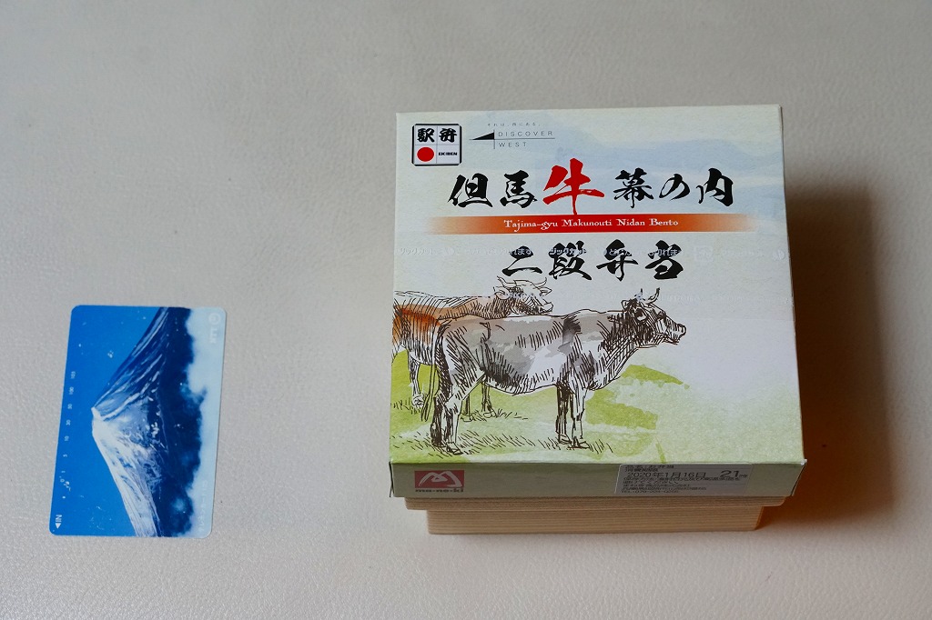 秋冬の駅弁大会シーズンに向けた、2019(令和元)年秋の新商品か。中身は駅弁の名前のとおりで、白飯に但馬牛を載せる下段と、焼サバ、コロッケ、煮物、黒豆、漬物などを収める上段の組合せ。但馬牛の使用をふたと食品表示で名乗るが、そんな高級な牛肉が使われているような雰囲気はなかった。姫路駅で買えるかどうかは分からない。価格は2020年の購入時で1,190円、2023年時点で1,200円。