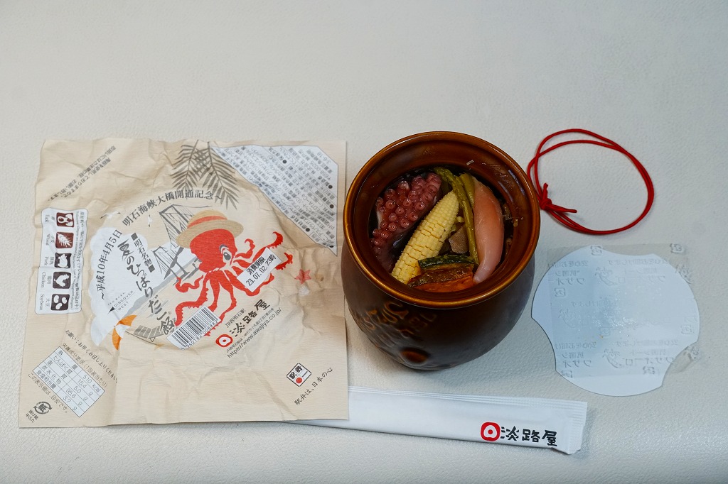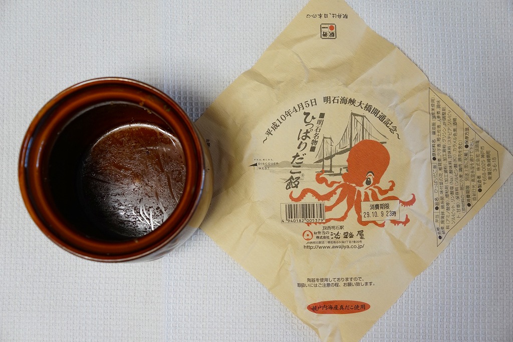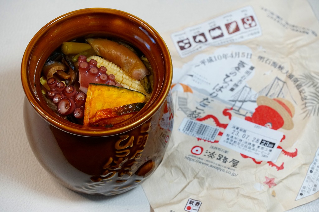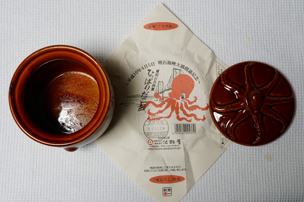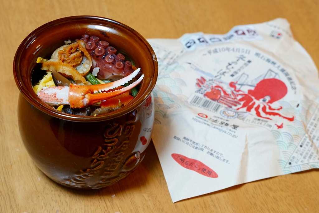 1998(平成10)年4月5日の明石海峡大橋開通を記念して発売。明石や神戸と関西や日本を代表する、有名で人気の駅弁。関西人ならみんなこのタコツボ容器を持っているといわれる。たこつぼ状の茶色い焼き物容器の中に、明石のタコのうま煮やすり身天ぷらを、醤油味の炊き込み御飯やタケノコ・穴子・松茸・人参などとともにぎっしり詰める。掛紙の裏面に追記されたとおり、明石だこの不漁により、2017(平成29)年5月から瀬戸内海産のタコを使っているという。