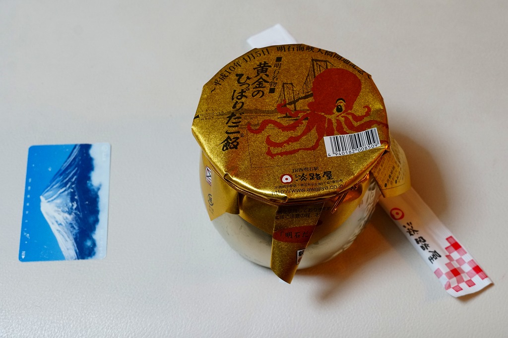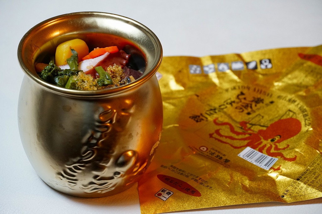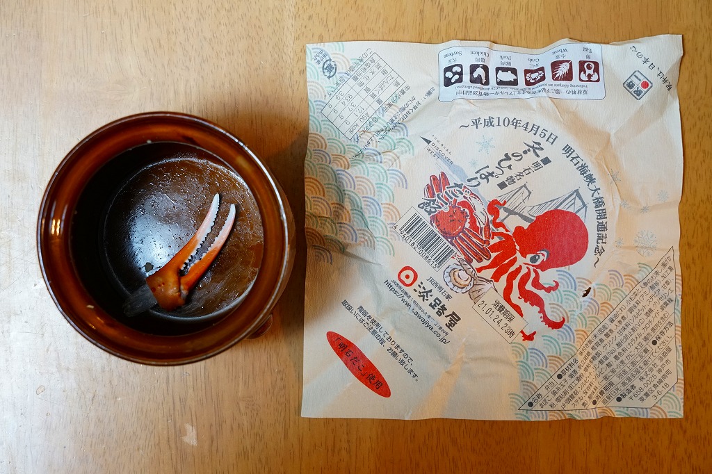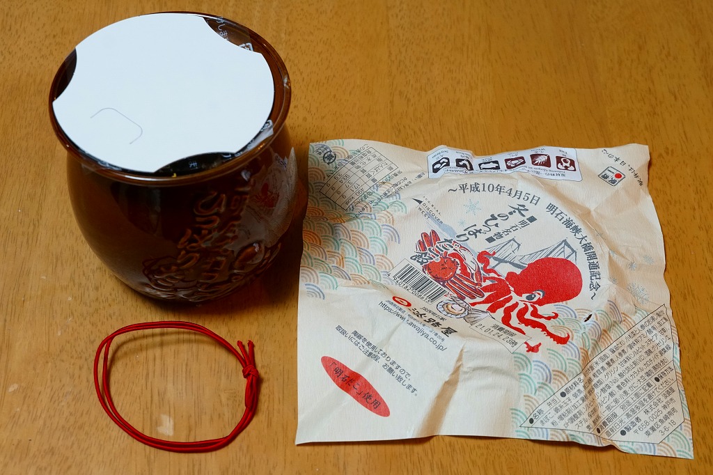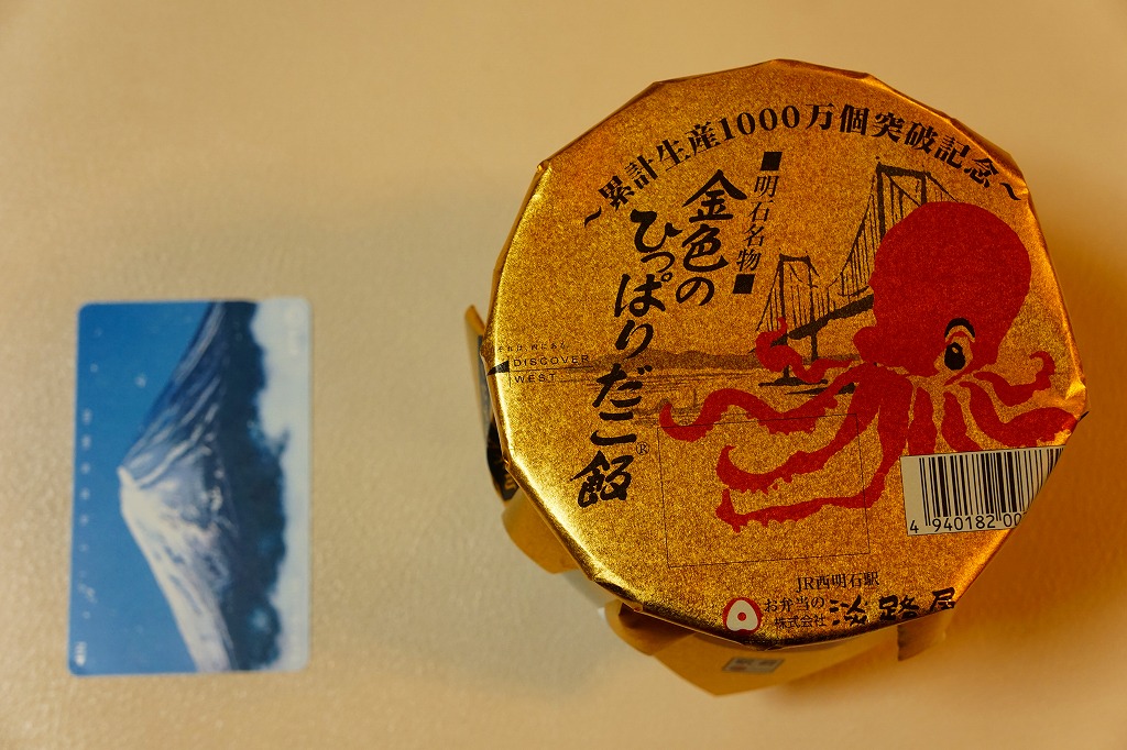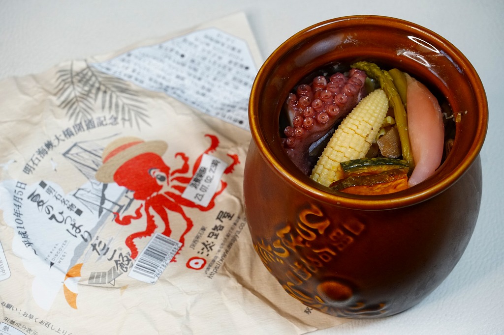 1998(平成10)年4月5日の明石海峡大橋開通を記念して発売。明石や神戸と関西や日本を代表する、有名で人気の駅弁。関西人ならみんなこのタコツボ容器を持っているといわれる。たこつぼ状の茶色い焼き物容器の中に、明石のタコのうま煮やすり身天ぷらを、醤油味の炊き込み御飯やタケノコ・穴子・松茸・人参などとともにぎっしり詰める。掛紙の裏面に追記されたとおり、明石だこの不漁により、2017(平成29)年5月から瀬戸内海産のタコを使っているという。