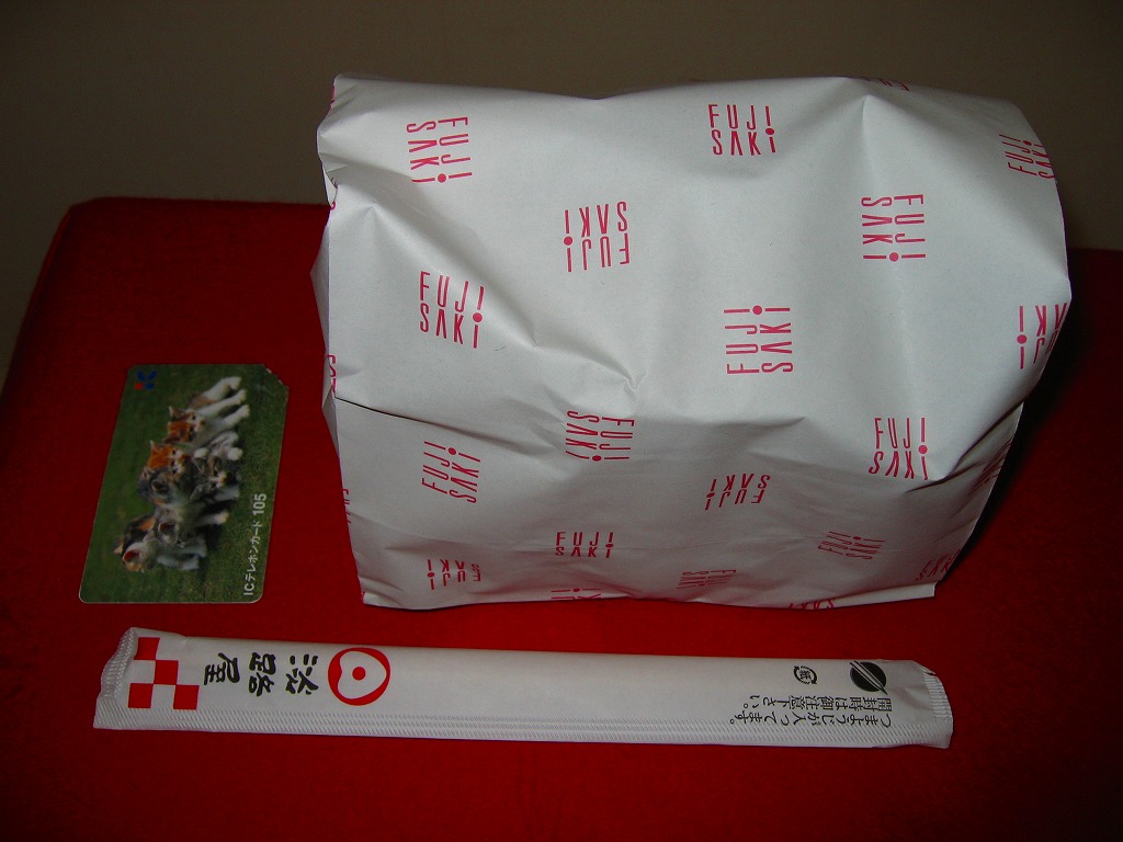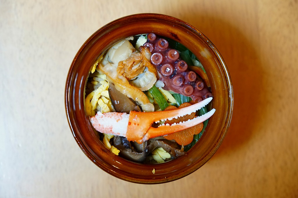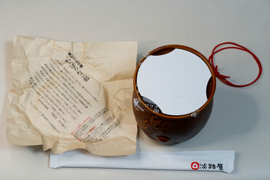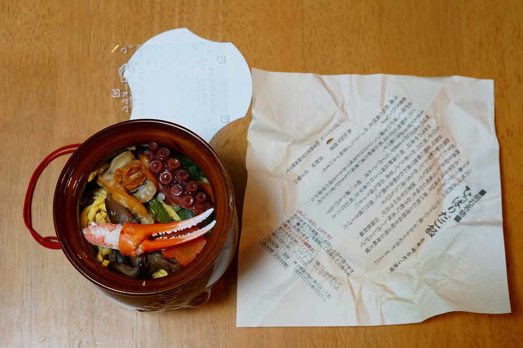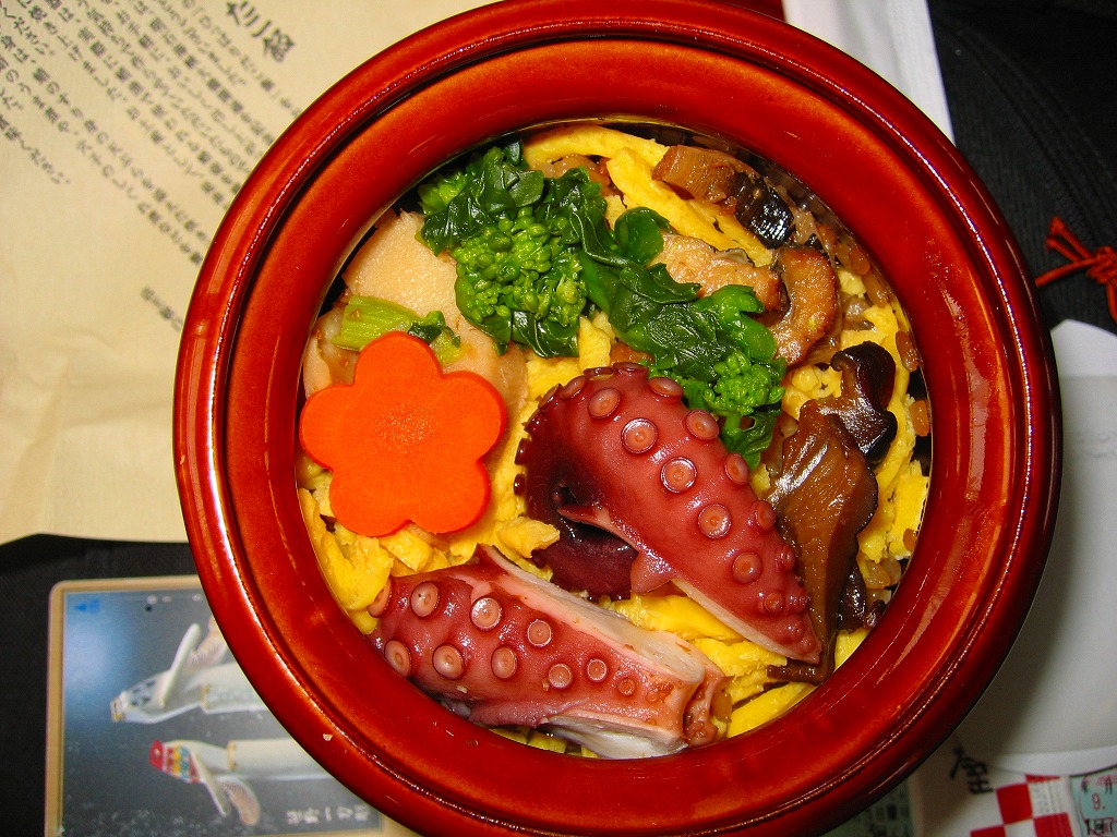 2008(平成20)年2月3日から8日まで、仙台の藤崎本店で開催された駅弁催事「全国駅弁大会とうまいもの市」で、実演販売されたお弁当。通常版のひっぱりだこ飯とともに、今回の催事でのオリジナル商品として、フタも陶製にしたバージョンが売られていた。中身は通常版とまったく同じ。フタは後からこしらえたとは思えないほど、本体の壷に自然な感じで組み合わさる。これが駅弁として販売されていれば疑義駅弁だが、ここではチラシでも実演ブースでもオリジナルと明記していた。現地にあっても、おかしくないような。