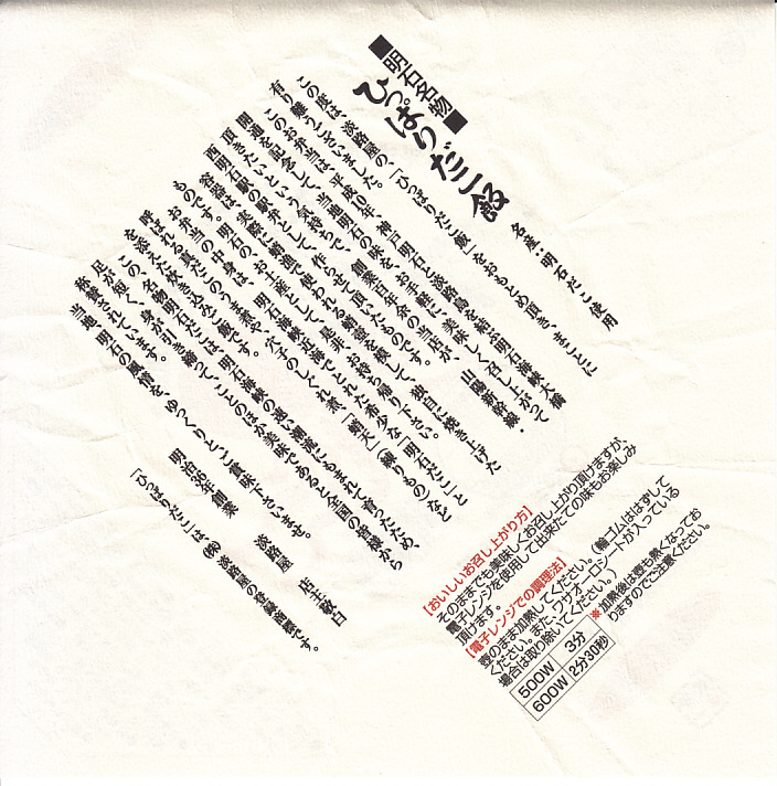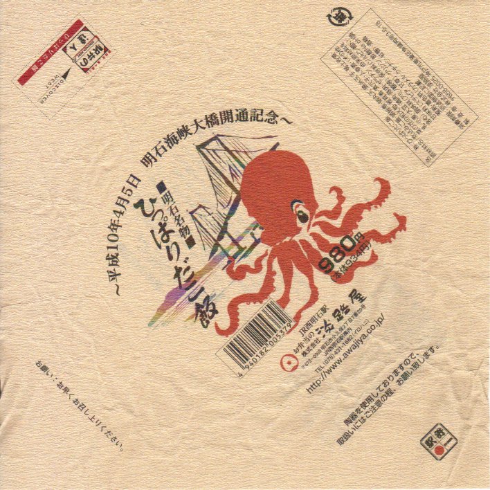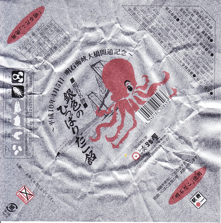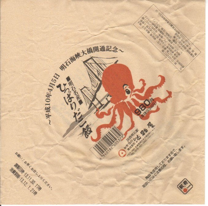 2001(平成13)年12月1日に購入した、西明石駅弁の掛紙。当時は「明石名物」でなく「明石名産」ひっぱりだこ飯であった。公式サイトのURLや、「紙」のリサイクル識別表示も、まだついていない。