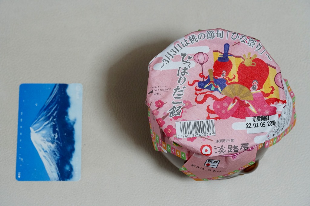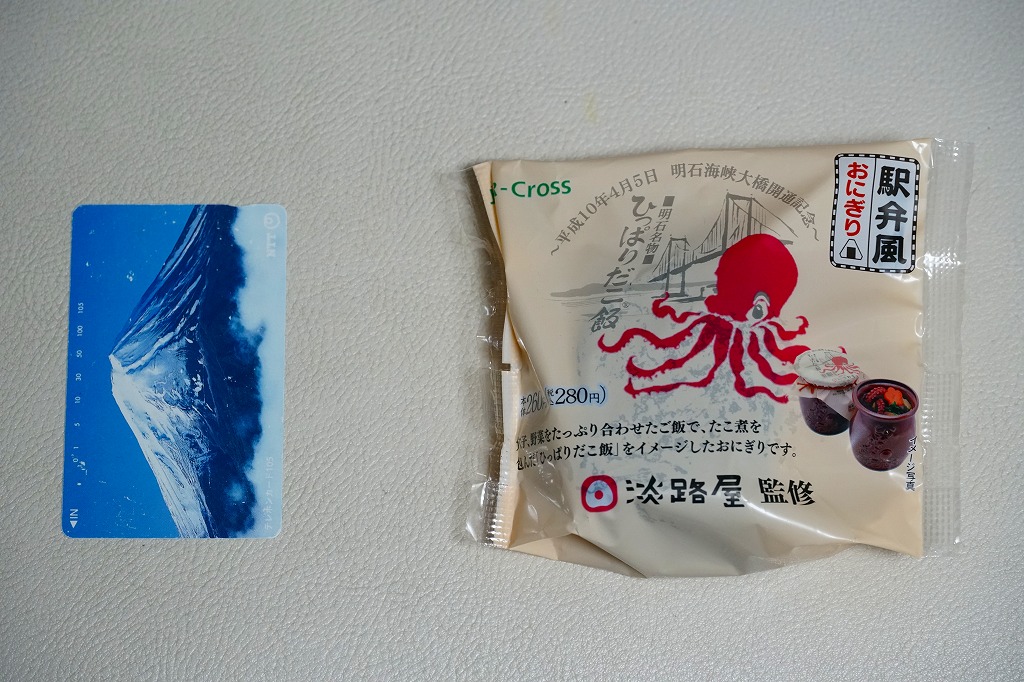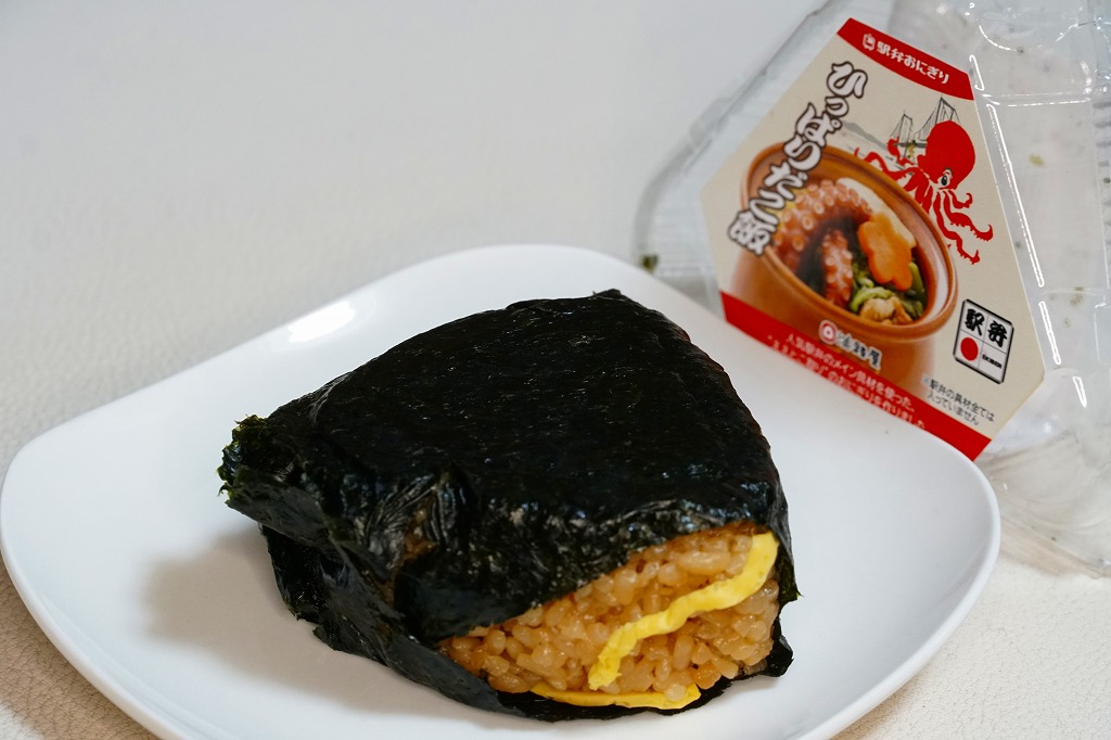 2023(令和5)年1月の京王百貨店の駅弁大会で販売。現物からは読み取れないが、「SDGs×駅弁」として「人気駅弁の端材おにぎりでフードロス削減」と広告し、3種類または5種類のおにぎりを輸送販売した。これは西明石駅弁「ひっぱりだこ飯」のもので、タコ煮と錦糸卵を味付き飯に押し付けて海苔で巻いた三角おにぎりを1個、商品紹介と食品表示のラベルを貼ったプラ製ケースに収めたもの。駅弁と同じ調製元が作るため、駅弁と同じ味がして、その点で下記のようなコンビニの再現品よりも本格的であり、価格もこなれている。いつかどこかで売られるように、なるかどうか。